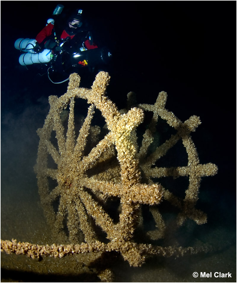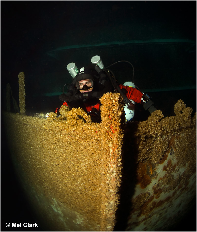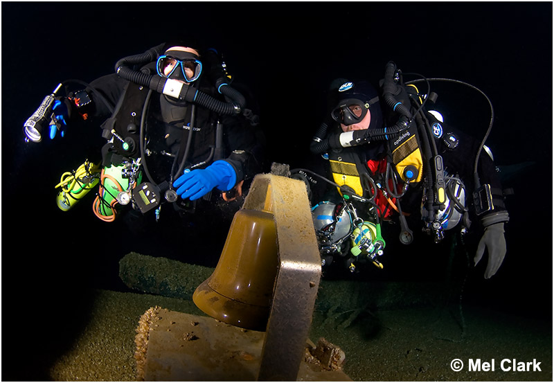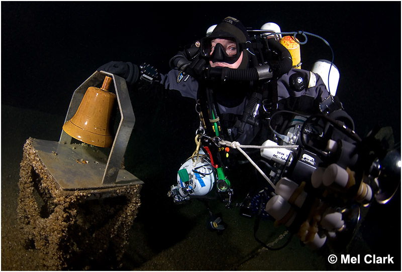 Above and below: CCR diver Curt McNamee poses beside the new ships bell. |