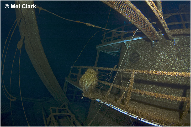 The weather gods were still shining on us for day three and we decided to do the bow section again. I wanted to get into the pilothouse and also to determine if the wreck was separated or not. I realized this was not a realistic single dive goal so we split the team in two. Ron, Jitka, Curt and I would get some more images of the bridge and superstructure. Erik and Tom would use their scooters and head to the break section. |