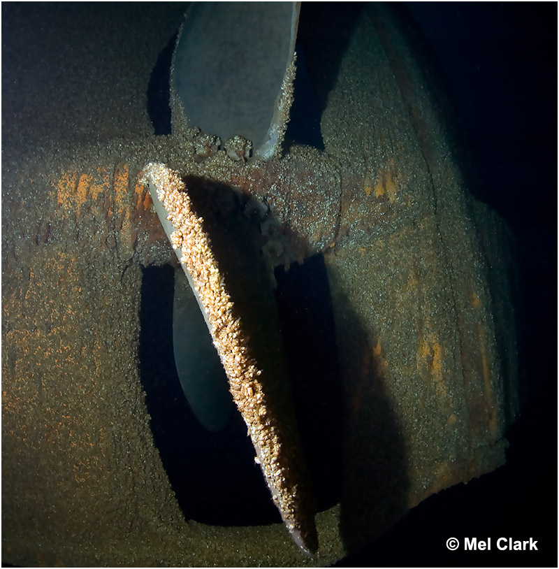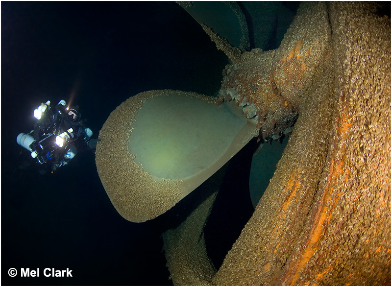 Below Images: The huge propeller and rudder of the Carl D. Bradley loom out of the darkness at a depth of 380 feet in the bone numbing 39 degree lake water. |