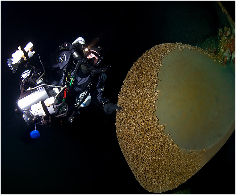 Our time on this dive is rapidly expiring, so Erik and I hit high gear on our scooters to get a quick glimpse of the bow. It is amazing to me how these huge ships can have such a narrow pointy bow. I get a shot of Erik at the bow and it looks like he is in a large rowboat not a 639-foot freighter! Erik and I head back to the upline with over three hours of decompression ahead of us. As I pass over the front superstructure I can’t help but notice all the portholes and wonder how nice they would look in my front room. Of course there is not time for such vandalism and it is not allowed either.