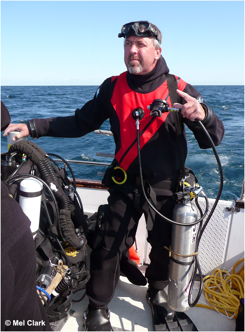 Below: Great Lakes wreck diver Ron Benson prepares as a safety diver for the first returning divers from the Bradley. |