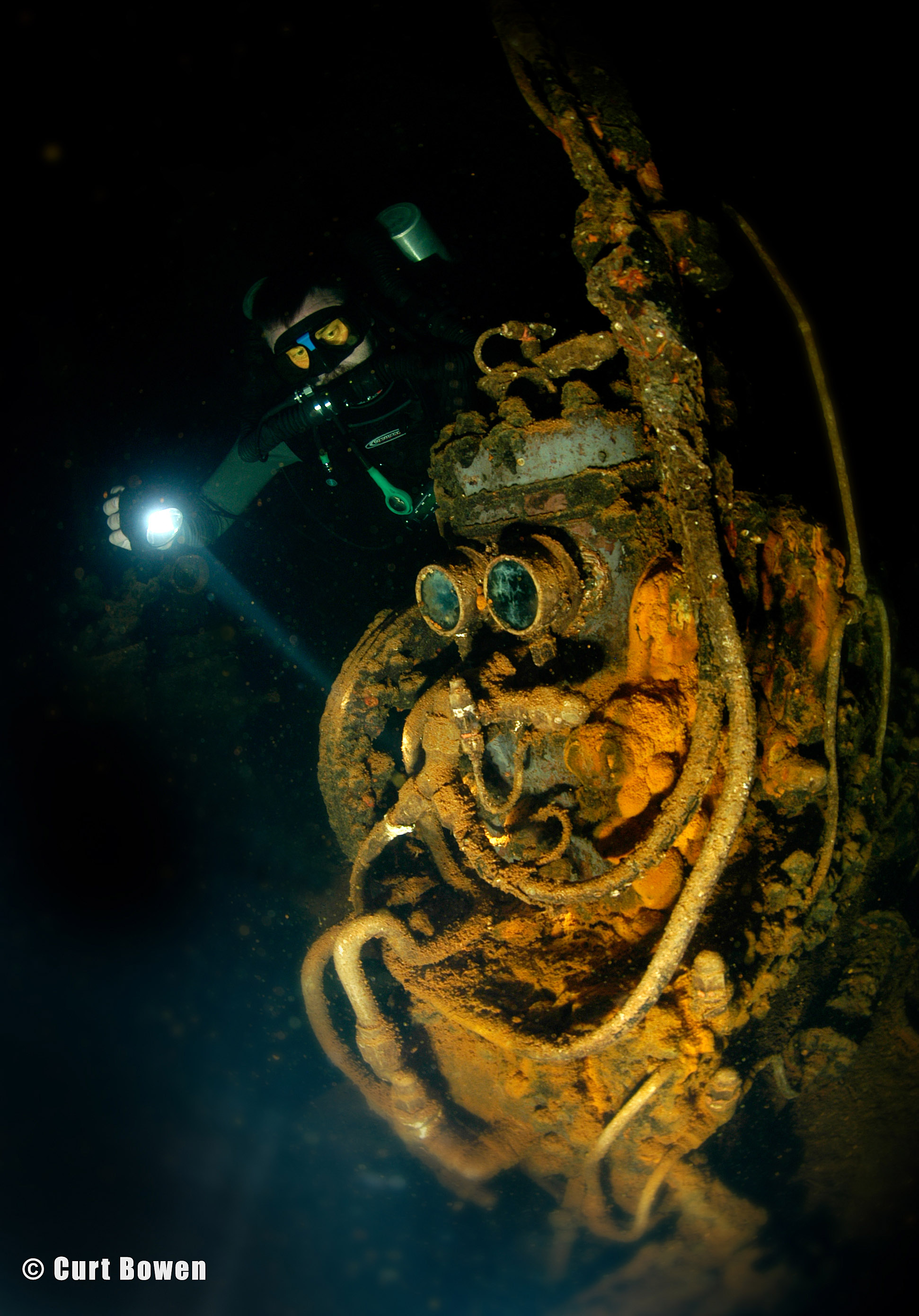 Above: Exploring deep into the third engine room level of the Heian Maru, CCR diver Ron Benson discovers this engine room telegraph and engine pressure gauge panel.