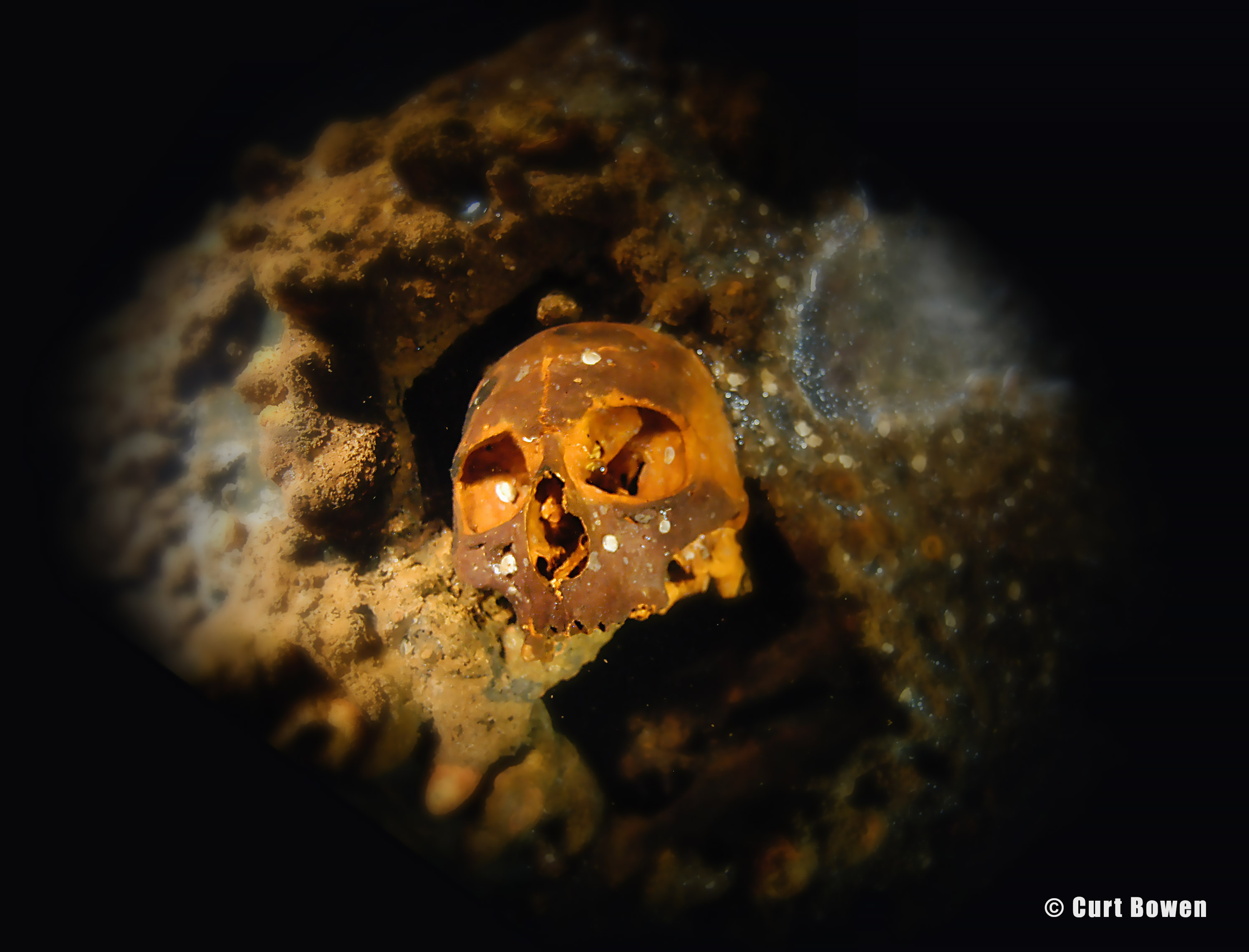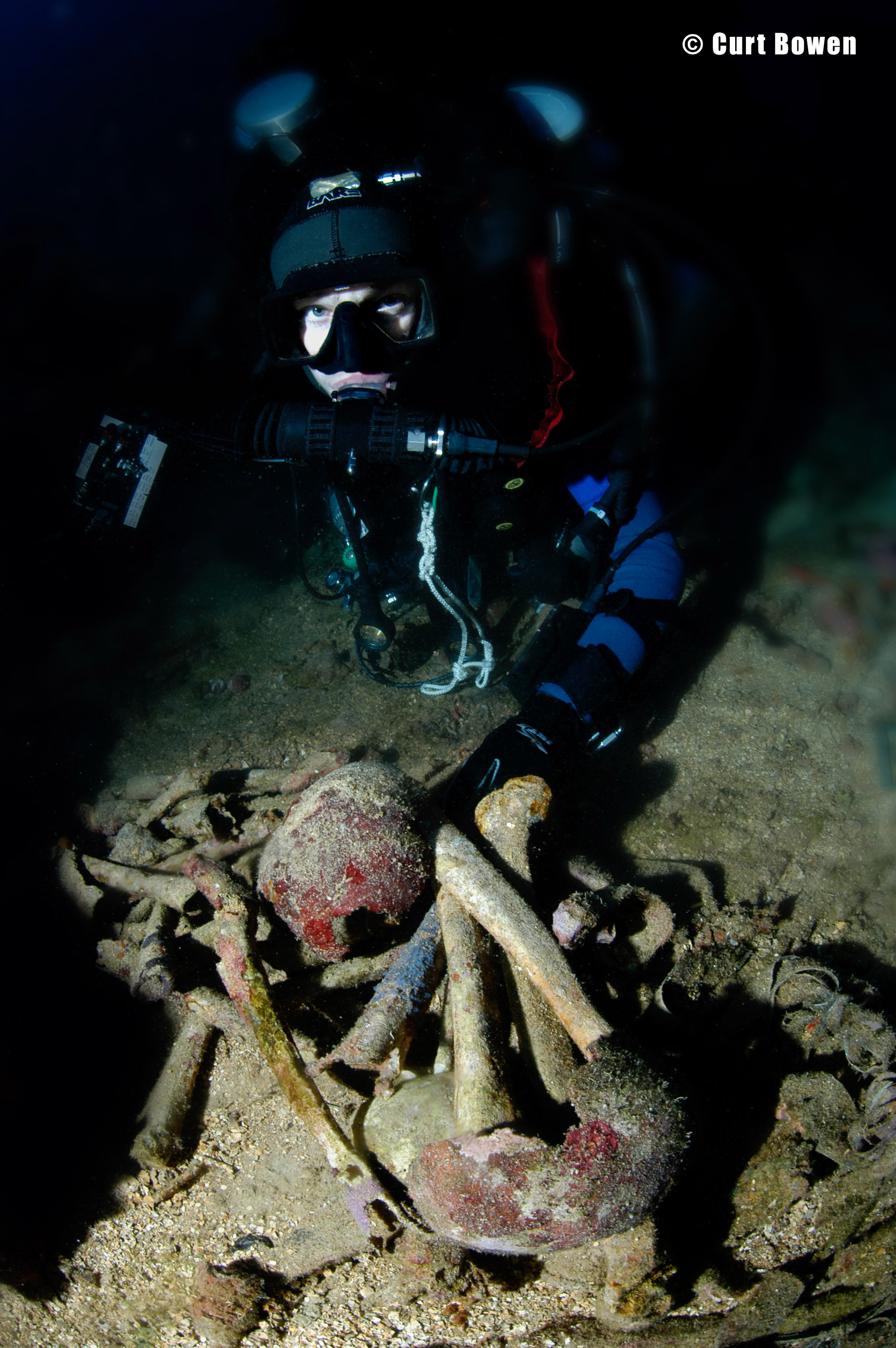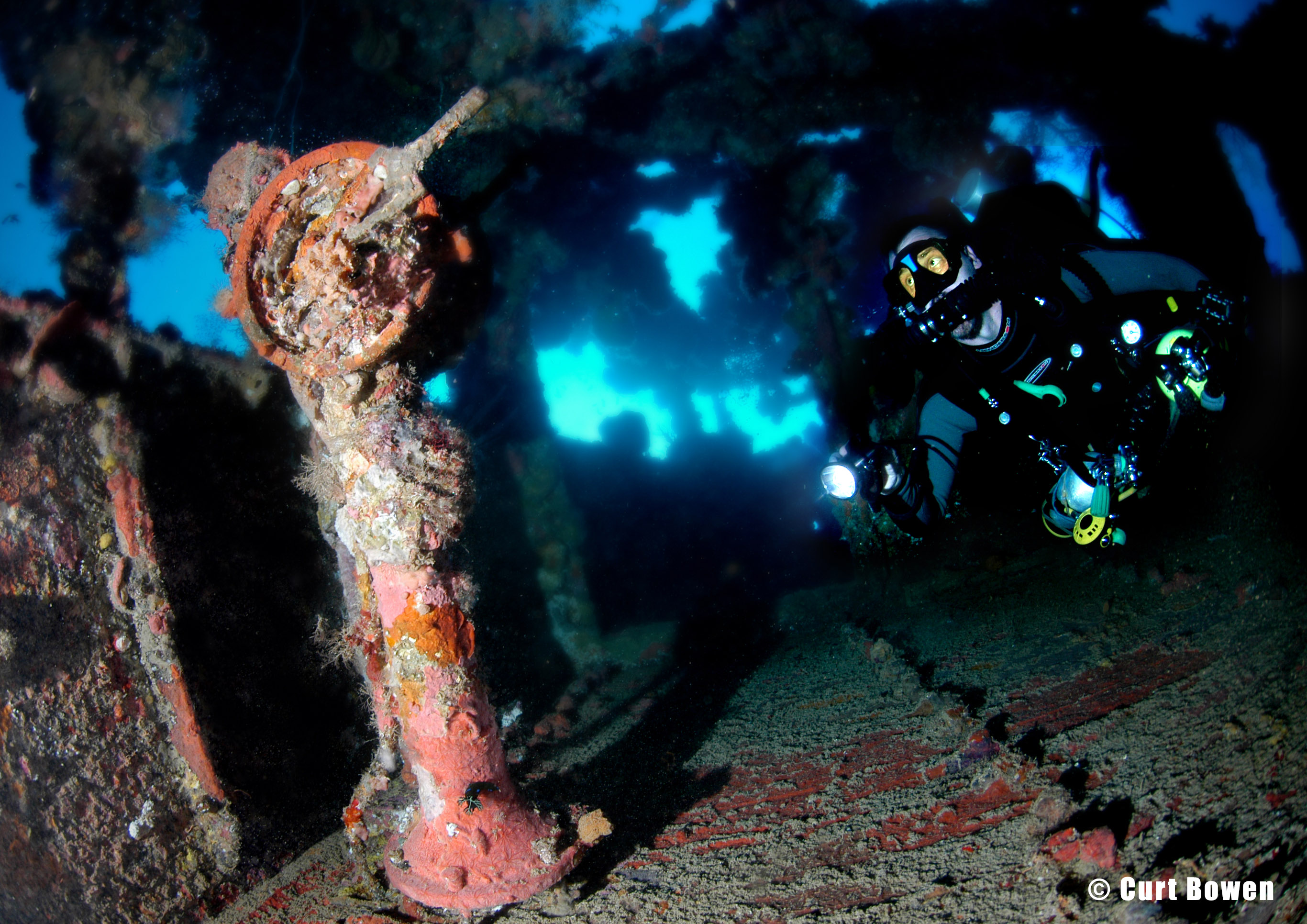 Above: CCR diver Ron Benson illuminates a large air