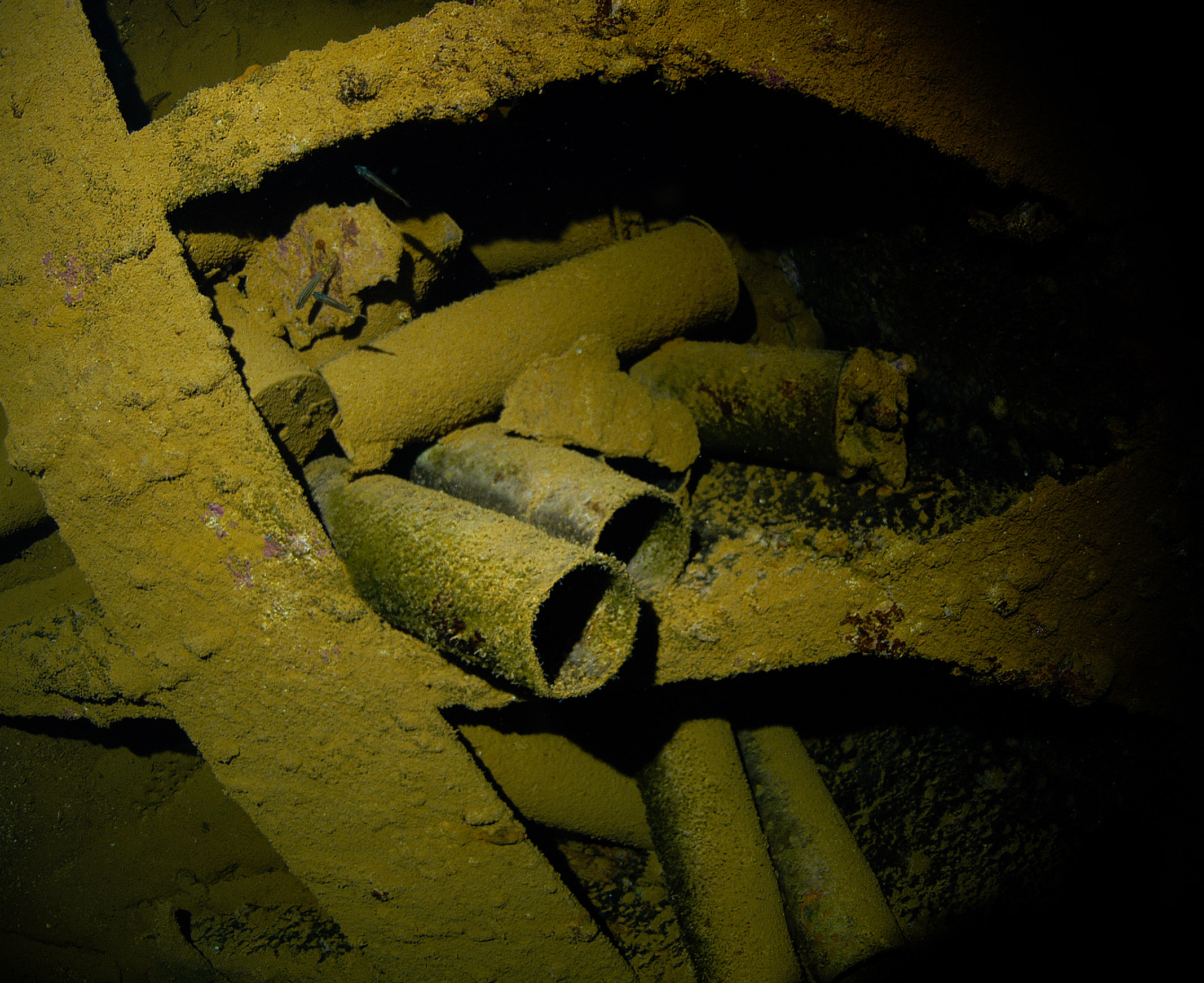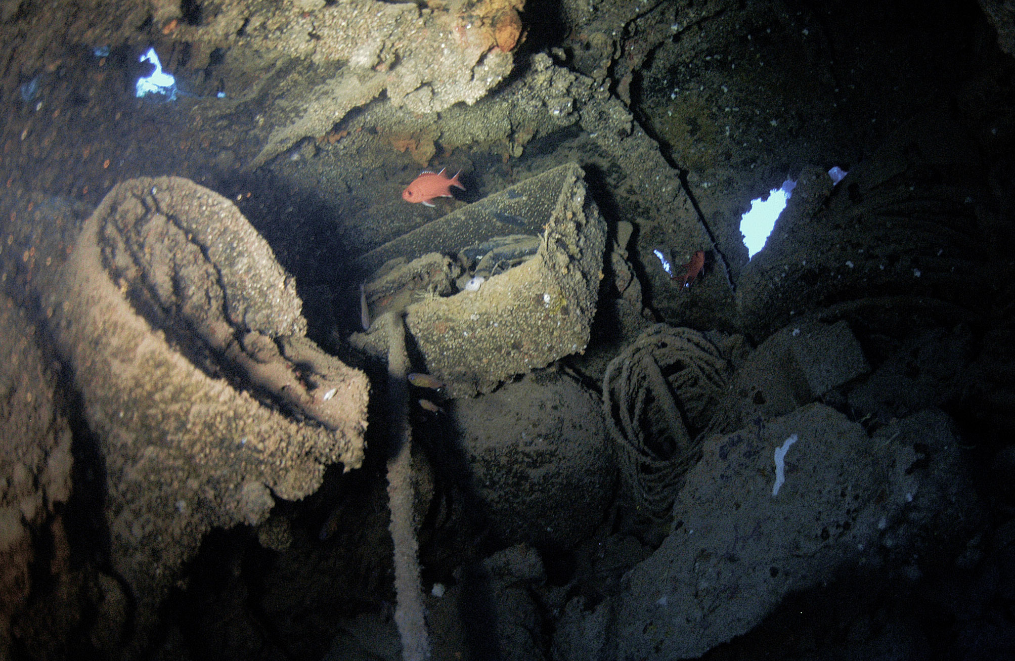 Below: Scattered throughout cargo hold #5, these 14-inch diameter artillery shells were destined for one of the large Japanese battleships, Yamato or Musashi. |