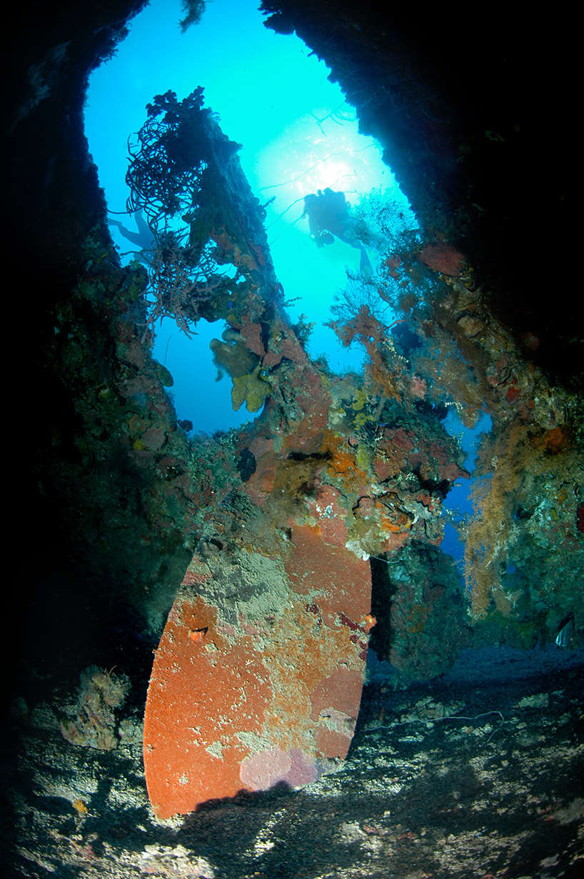 Below: A diver poses behind the Fugikawa’s massive single prop. |