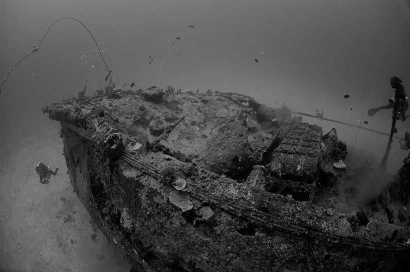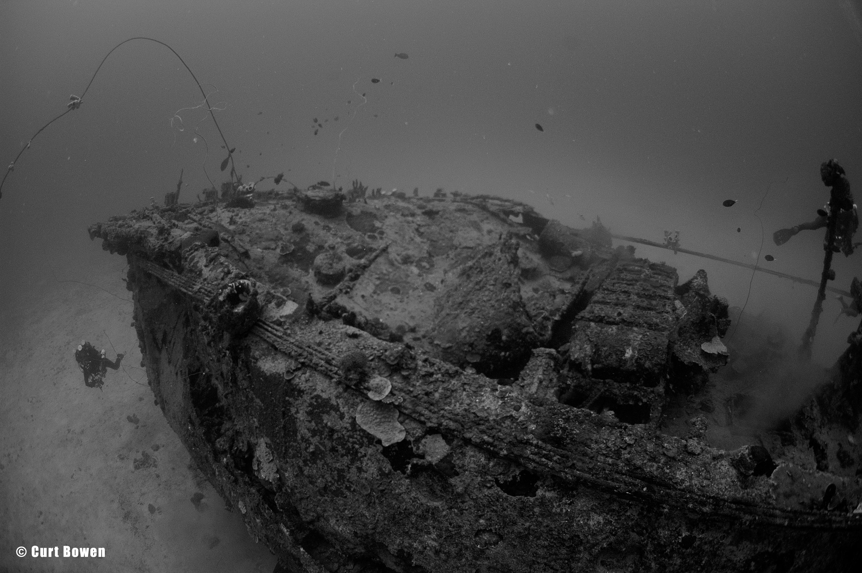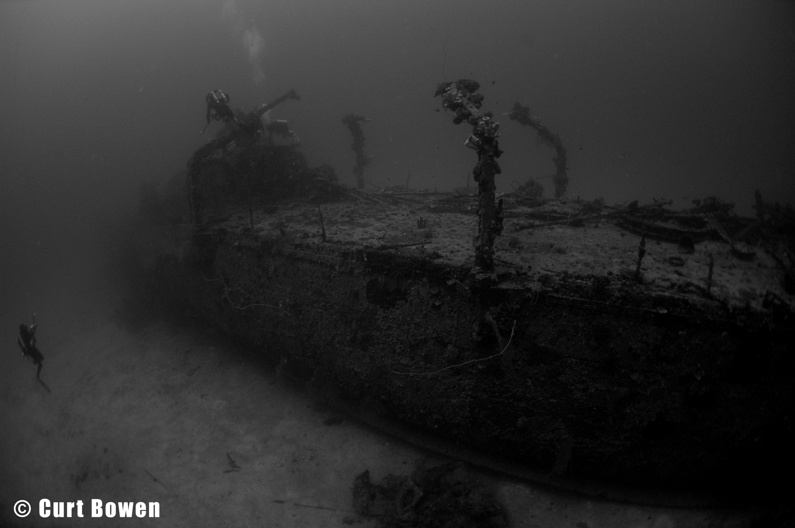 Above: CCR divers inspect the stern section of the Oite. Max depth 202 feet.