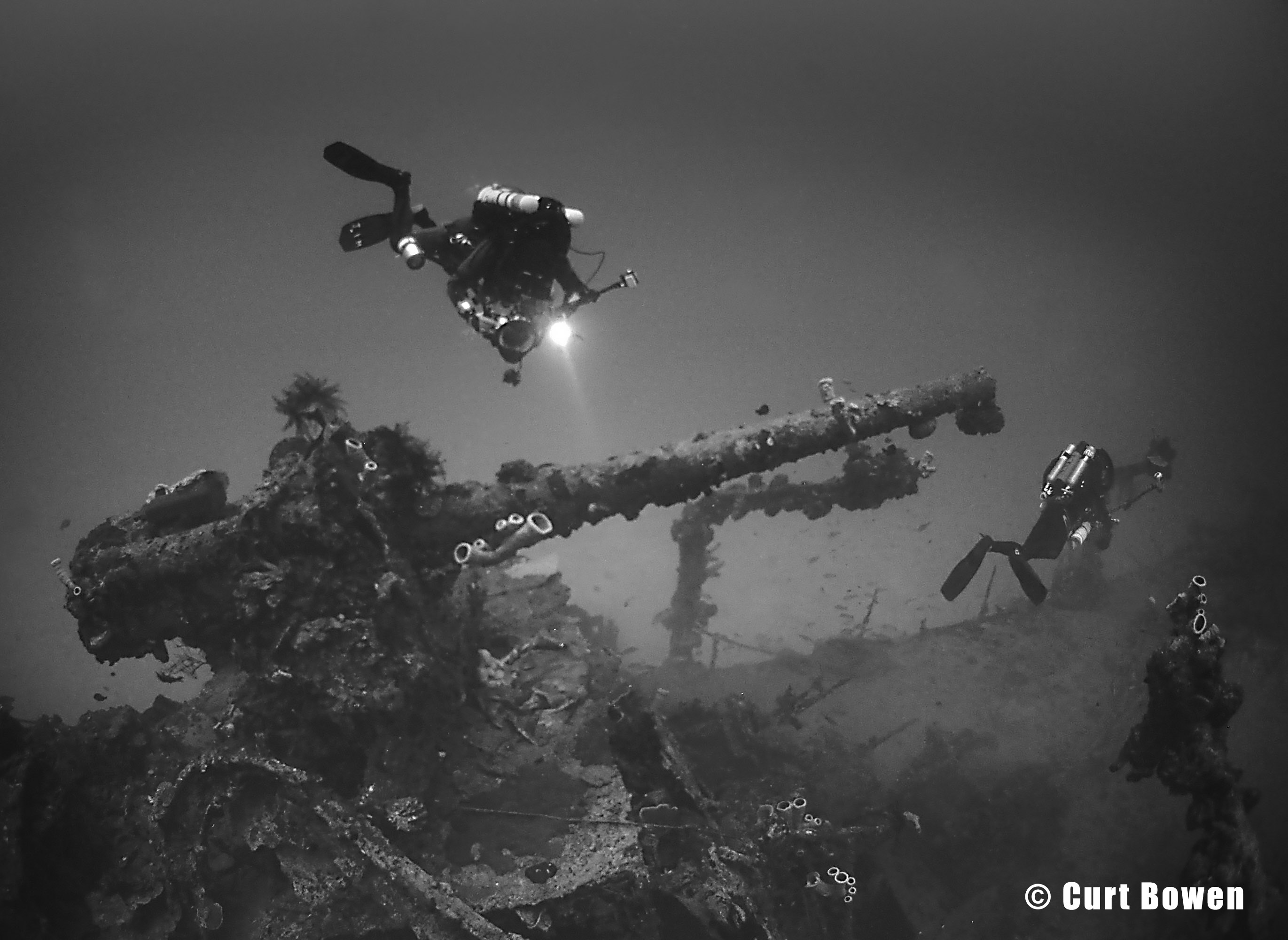 Cover Photo (TOP): Closed circuit rebreather diver Jim Rozzi explores the bow deck artillery on the San Francisco Maru.