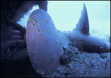The stern of the ship contains a small artillery piece and an access hatch entrance for the below deck stern rooms. Swimming around the stern you will discover a massive single propeller and rudder encrusted with soft corals. (right photo)
