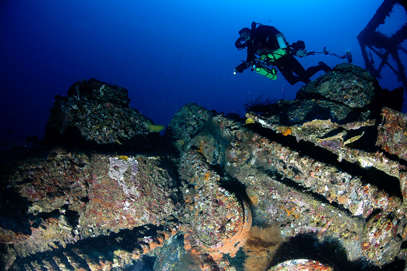Above: CCR diver Jim Rozzi examines the large bulldozer in cargo hold # 5.
