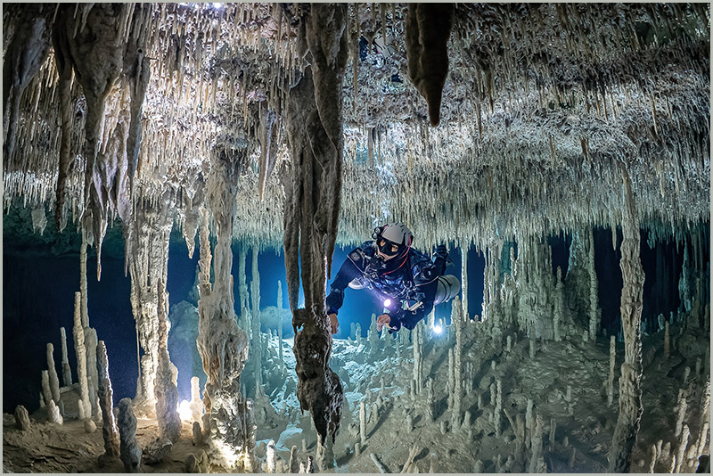 My first cenote dive was at Dos Ojos, and the moment I dropped below the surface, my life changed. A clear, blue tunnel twisted off into the distance. Sparkling white sand covered the floor of the cavern, thin, delicate stalactites adorned the ceiling, and massive columns rose like trees around me. Almost out of sight, I saw two cave divers in doubles swimming off into a dark hole. What was around that corner? Where were they going? I needed to know.