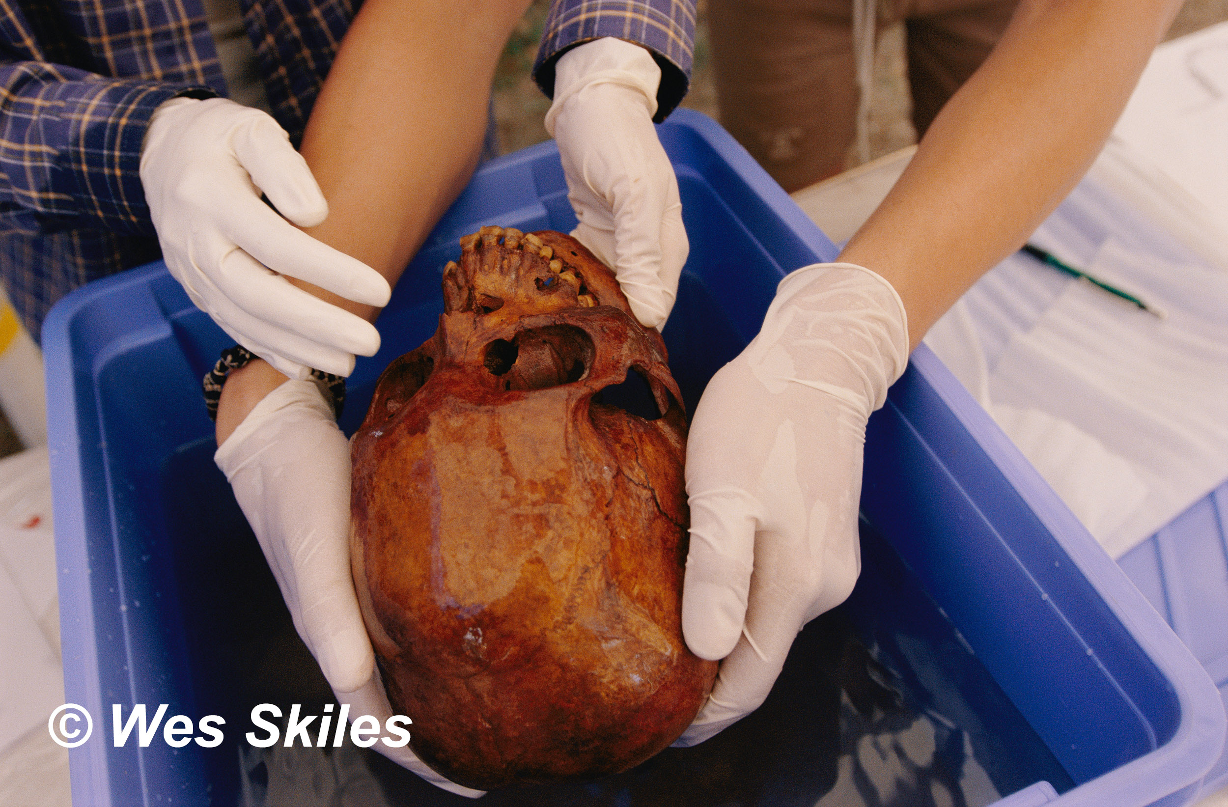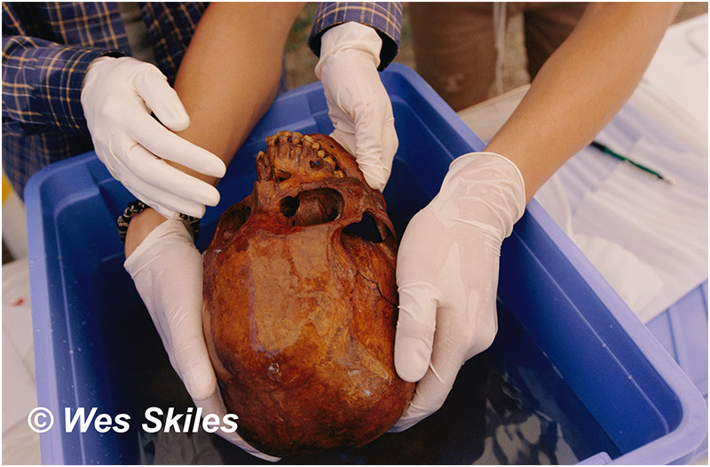 Above: INAH Archeologist examine the skull recovered from “Well of Time”
