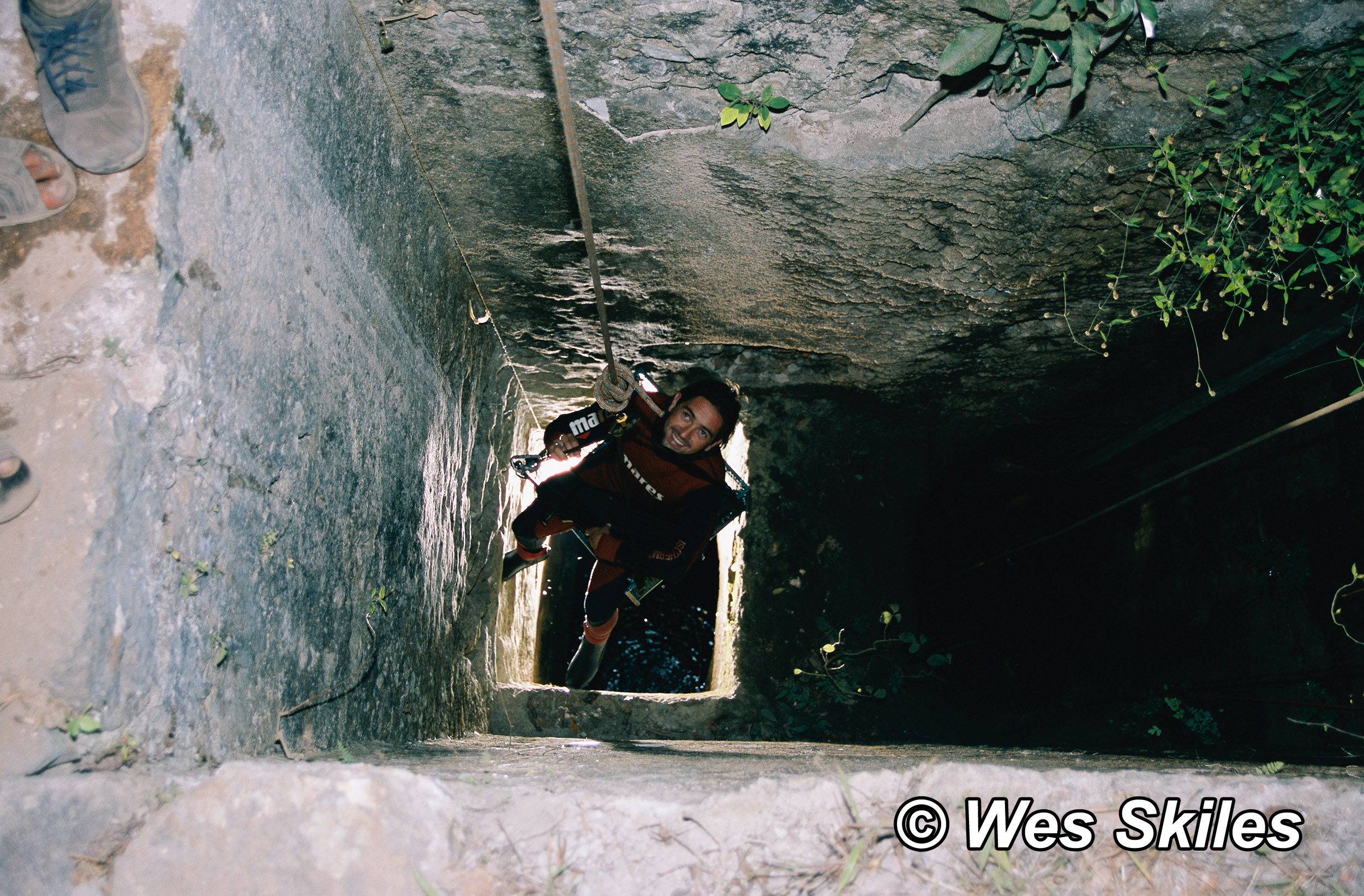 In the center courtyard of the hacienda was a raised platform surrounding the main well shaft. Closer examination proved that deep below the opening was a large subterranean cavern filled with cobalt blue water. Team member Scott Carnahan was lowered into the well for a quick reconnaissance. Within minutes he returned with promising news of a large dry cavern zone, deep water, potential underwater cave passage and lots of animal bones and pottery.