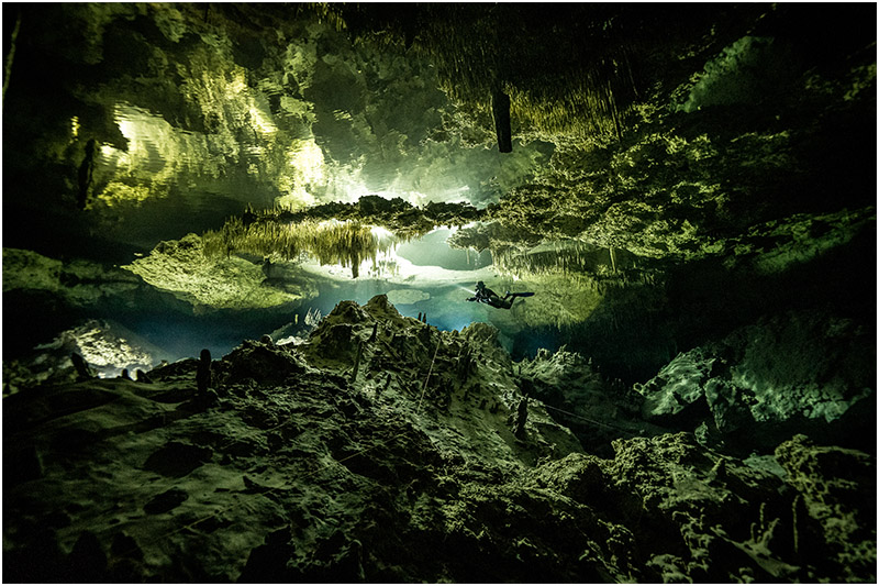 Below: Cenote Tajmaha, Room of Reflections, the day started with a broken engine and nearly cancelling the Day, our Plan B was to go with another car but to a closer Cave, this Photo was Chosen as Honorable Mention in World Water Day photo contest as ¨Best of the America’s¨, you never know when you will get the money shot.