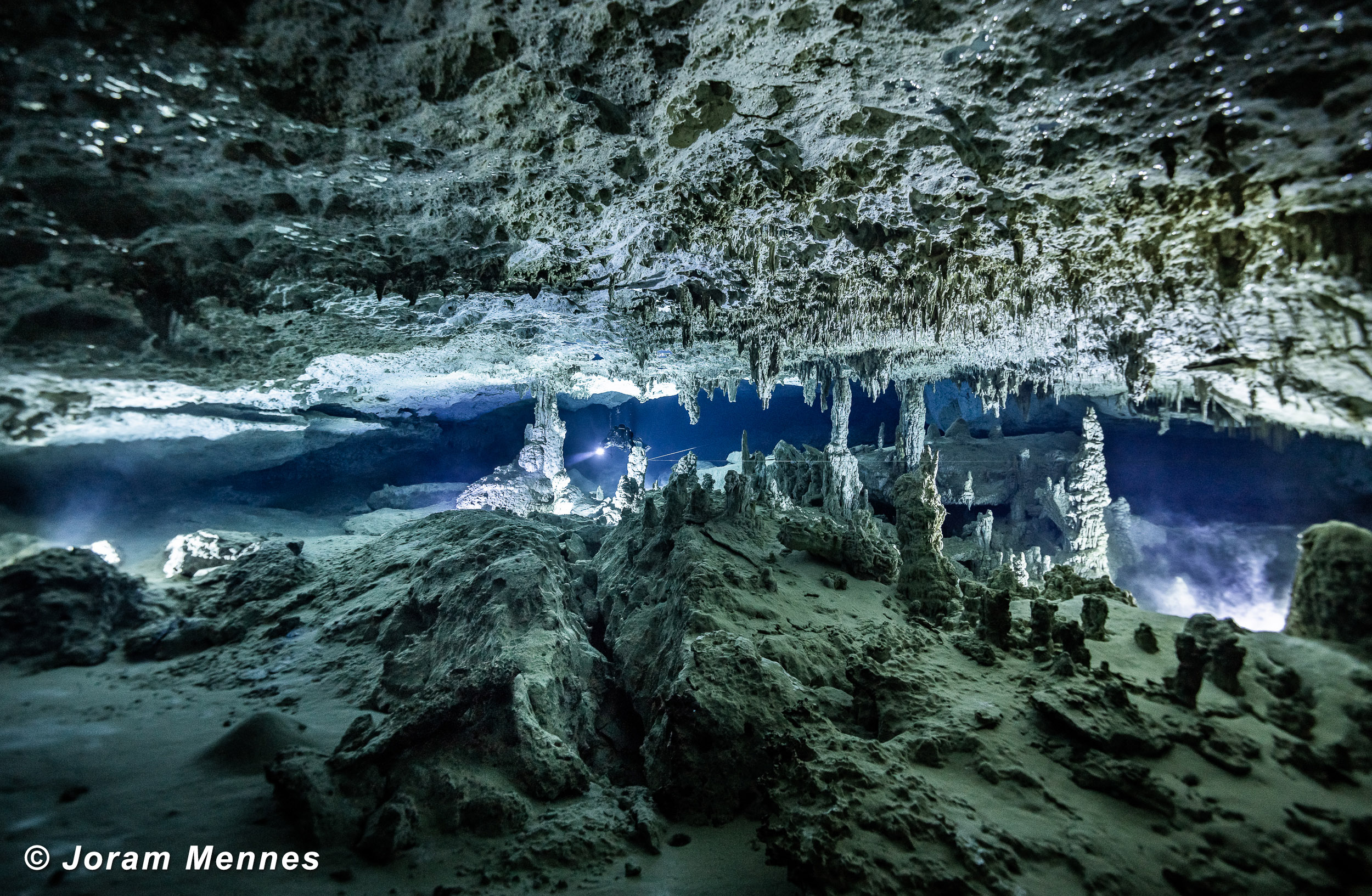 Below: Blue Abyss, one can reach from several points, either a 45 minute swim from Pet Cemetery, or a 75 minutes DPV ride from Nohoch NahChich, followed by a 15 minutes swim, one reaches this incredible drop down to Blue Salt Water that descents to 240Ft. 330.000 Lumen of light were used to illuminate the whole place up.