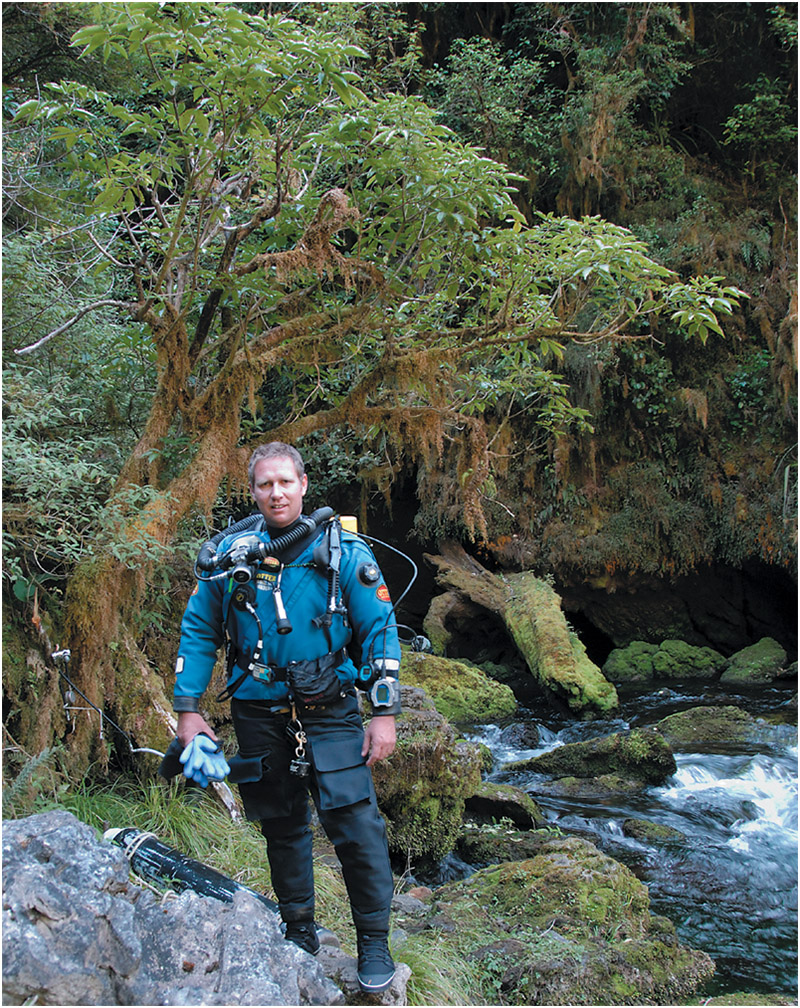 The age of international travel is amazing. Just 25 hours after leaving Adelaide in South Australia, I am in a helicopter touching down in the remote Pearse Valley, a few hundred metres from the resurgence of the Pearse River. Over at the camp, Australia’s Dave Apperley and British cave diver Rick Stanton watch with interest as Craig Howell, John Atkinson, and I unload the chopper and move aside as it departs, leaving us in the glorious wilderness of the Kahurangi National Park, New Zealand.