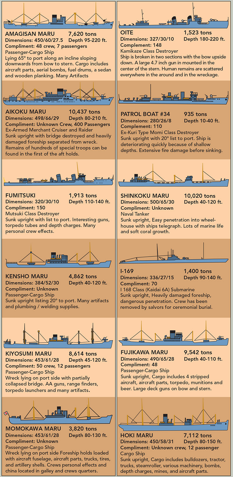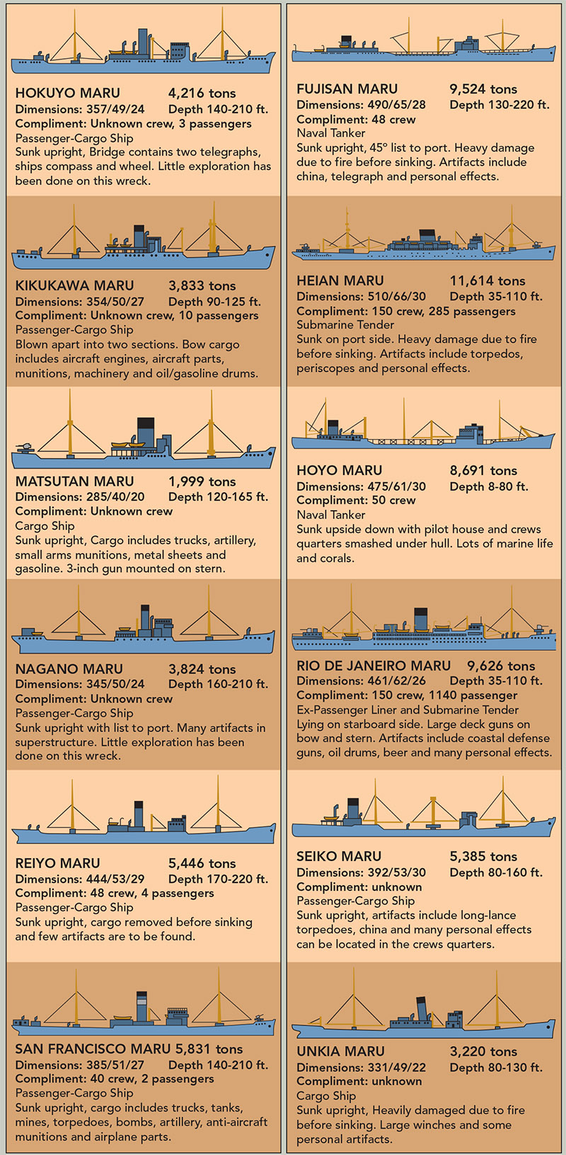 The geography of Truk made the perfect site for a naval base of the WW II era. The 40-mile diameter lagoon is encircled by shallow reef nearly 140 miles in circumference. At those distances, Japanese warships within the lagoon could stay outside the range of allied naval fire. The five navigable passes into the lagoon were strongly protected by artillery on flanking islands, and most were heavily mined. Navigation over the reef was impossible. Depths within the lagoon exceed 240 feet, providing plenty of mean water for ship and submarine navigation. Approximately 245 volcanic islands dot the lagoon, some with elevations in excess of 1500 feet. These islands were prime locations for airstrips, surface ship and submarine repair bases, troop barracks, bulk fuel storage, and radio communications. Most were heavily armed with antiaircraft weaponry.