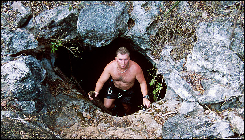 Below: Cave explorer and publisher of Advanced Diver Magazine, Curt Bowen climbs out of a small cave. |