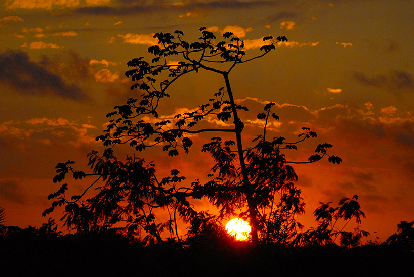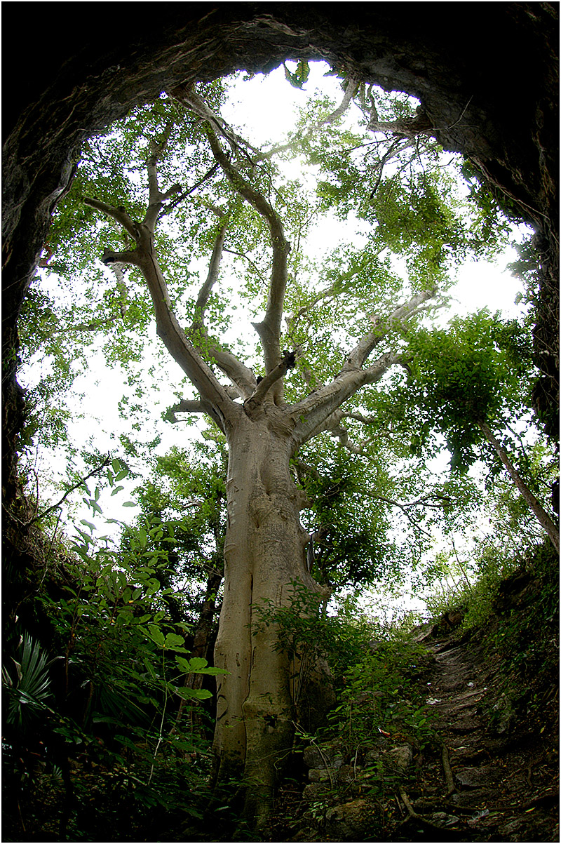 Above: An natural marker in the jungle. Large Bayan trees reach far above the Yucatan scrub jungle. These trees are hints of hidden Cenotes as they require tremendous amounts of water and are often found with their long roots streaching 100 plus feet below forming large root islands on the waters surface of large Jungle Cenotes. |