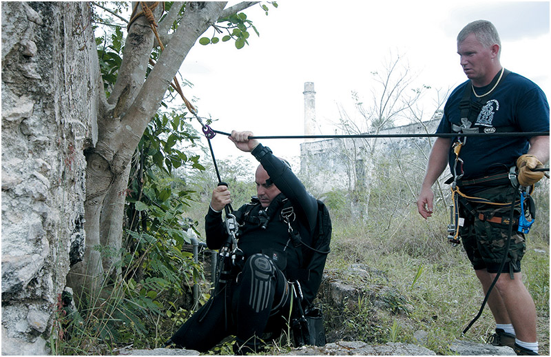 Above: Curt Bowen controls the ropes as explorer Jeff Toorish is lowered into Cenote Lazaro Carderas in order to photograph some discovered human remains.