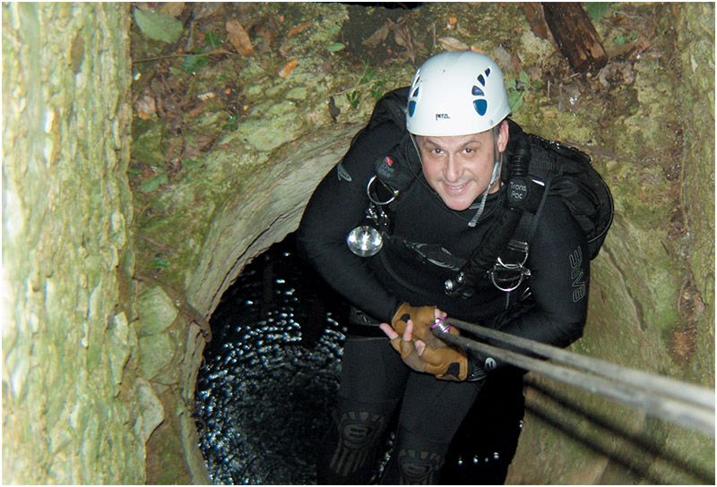 The most memorable event of the day was a cenote down a 70-foot cliff (see illustration on below page). It was Matt’s turn to make the initial exploration. This particular sinkhole would require rigging climbing gear, and lowering Matt straight down in the water.