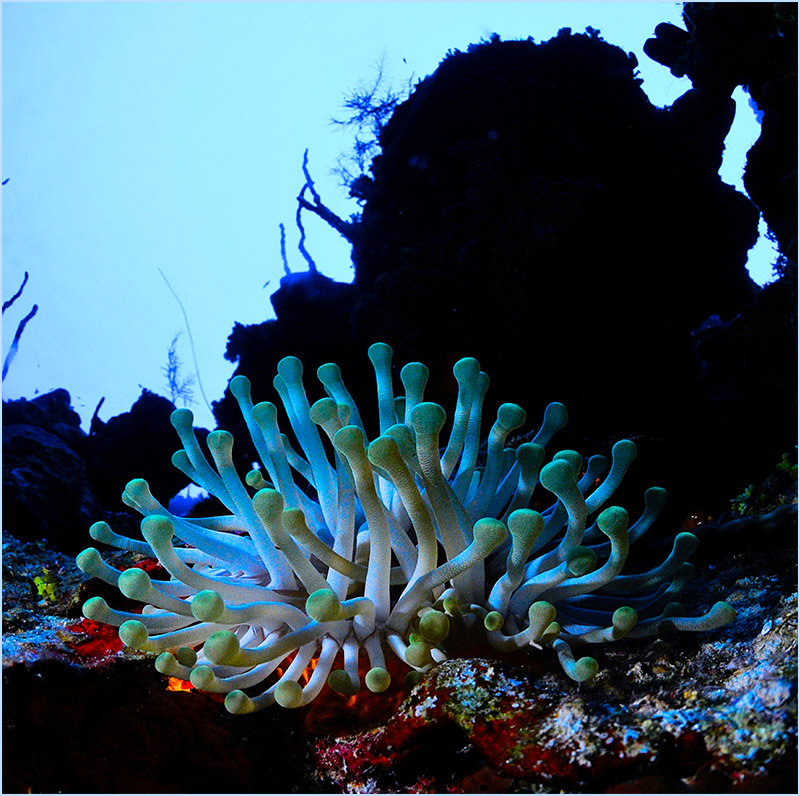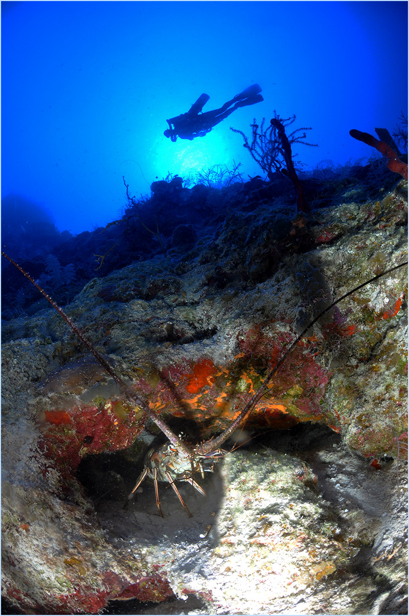 Holding your descent, you’ll notice the playful nudge of the placid current accompany you as you turn to observe the magnificent wall formations that curve sharply along the contour of the island. You’ll observe the strange and mysterious long arms of the black corals jutting away from their rocky anchors, bridging into the clear blue water. While noting how they oddly resemble the fruitless branches of autumn’s barren trees. Occasionally, a curious, lonely lobster will peek out to observe your presence, stretching out their antennas, keenly detecting your vibe as they purposely watch you swim past.