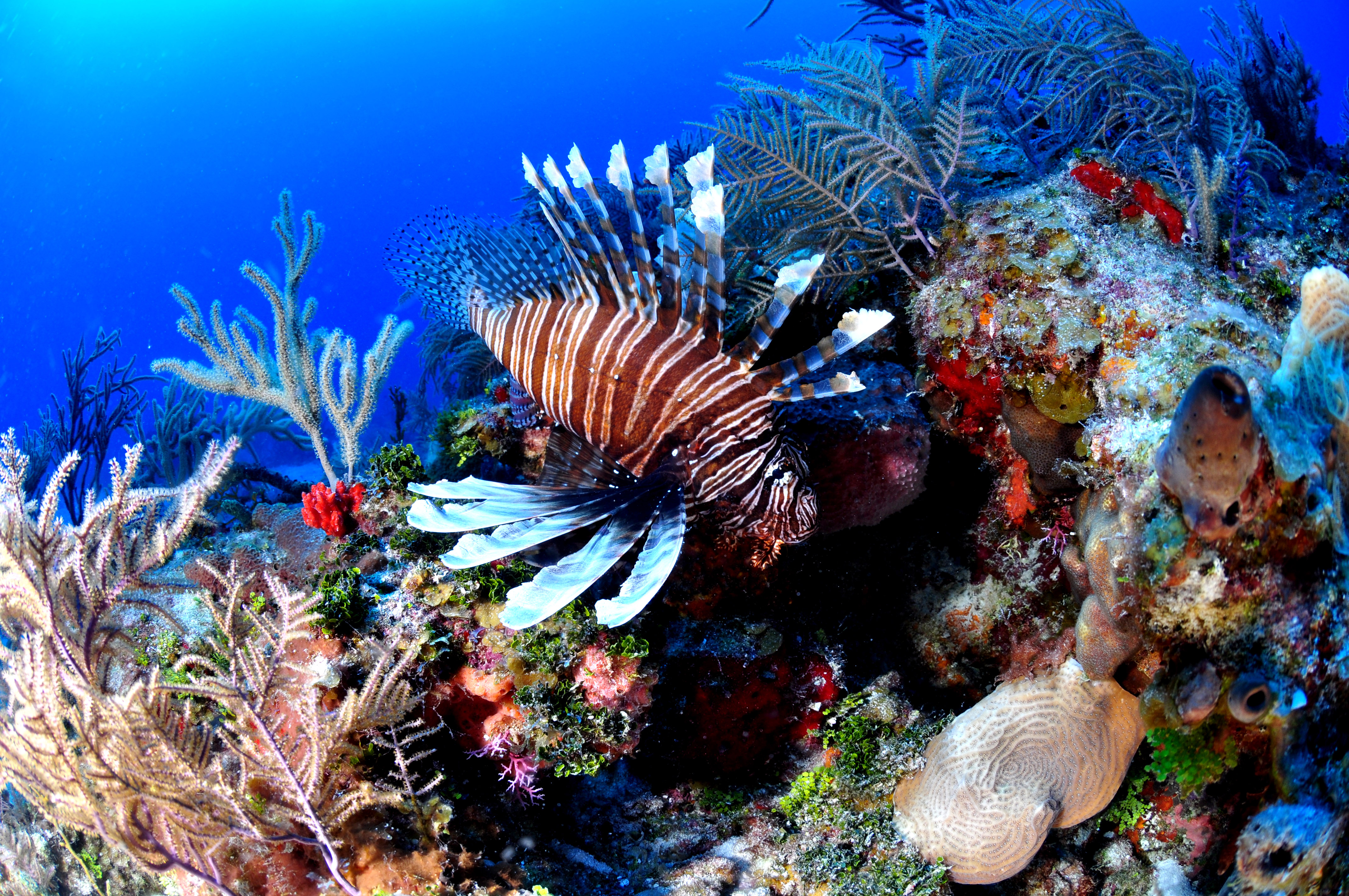 Once I was joined by my teammate, we moved to the hole – the edge delineated by blackness. Because of the sheer size of the hole, it appeared to be a 90-degree wall to nowhere. As I descended, the reef seemed to roll into the hole. Life was everywhere, from small reef fish and lobster, to larger tuna. Some of these animals seemed curious about their bubble-less intruders, and swam right to us.