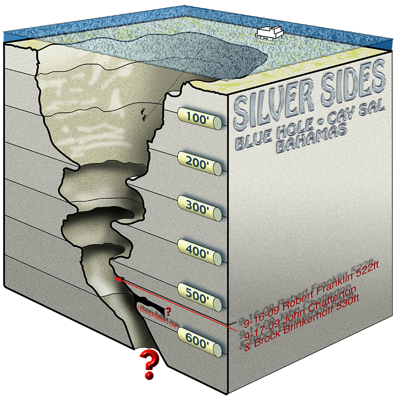 As we left Big Hole for our next site that night, the captain mentioned that the sounder hit a spot on the far side of the hole where it didn't return a depth, indicating that the hole was deeper than 152 meters (500 feet). The deepest measured blue hole known to exist is Dean's Blue Hole. At 202 meters (663 feet), it is located in a bay on Long Island, Bahamas.