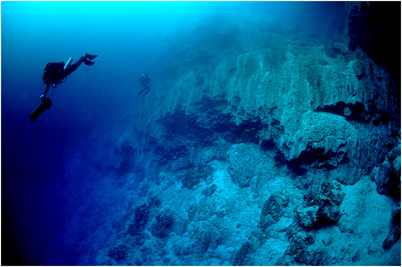Darkness set in quickly, and the lights came out. Me with my trusty 10W HID and John with a prototype LED light head. As we descended, the wall undulated from ledge to undercut. Descending even deeper, it was as though someone turned the “Scale” knob up – all of the features appeared rougher, less worn, and larger gaps appeared between eroded walls. The undercuts also became more severe. This resulted in a zigzag swimming pattern in order to stay in visual contact with the wall.