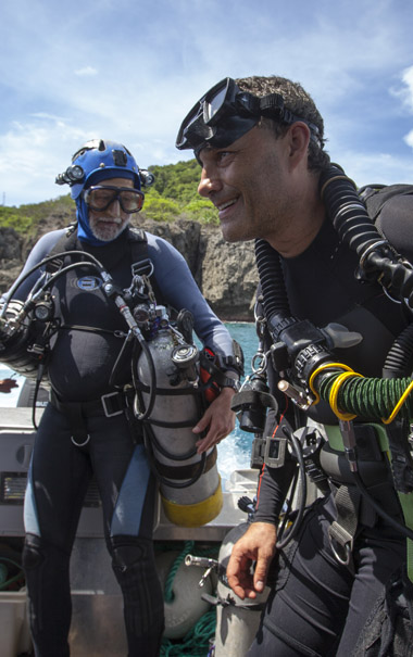 Left Photo: John and Craig prepare for a rebreather dive in a search of submerged cave springs off Christmas Island delivering fresh water from the inland aquifer.