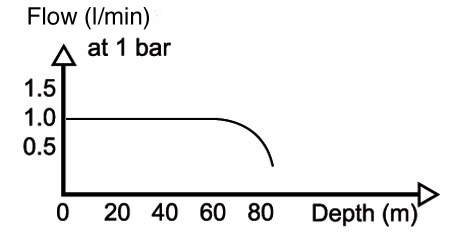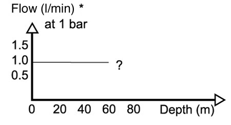 If we descend further to 40m, the absolute pressure in the water is now 5 bars. P1 is still 10 bars, as our regulator is ‘blind’, and we still have maximum volume flow (as P1 (10) is twice P2 (5))