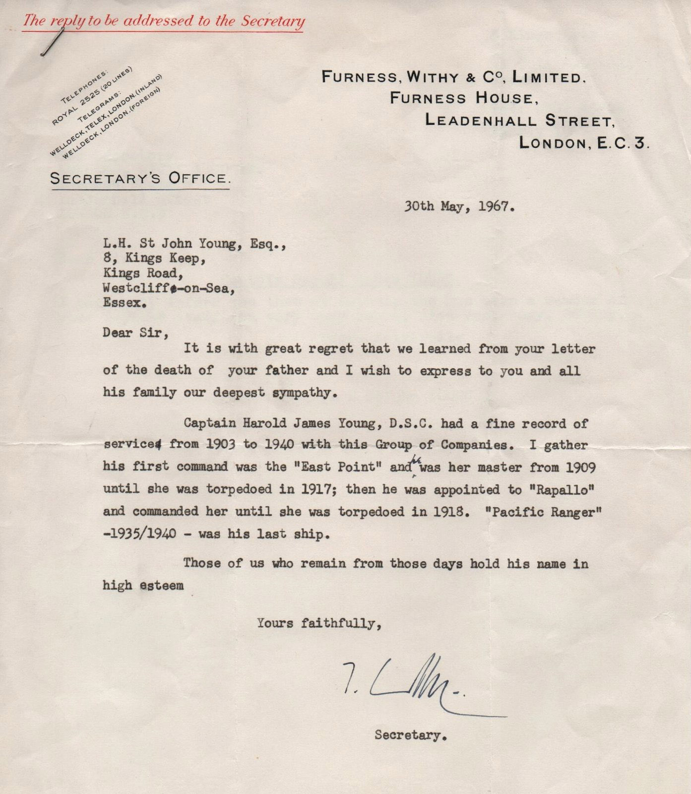 By 1909, Harold James Young had achieved command of the ss East Point, an 8,000-ton British merchant steamer managed by Simpson, Spence & Young. His career intersected with history repeatedly. In December 1915, during the Gallipoli campaign, the badly damaged East Point — under his command — secretly evacuated the 1st Scottish Horse directly from the Suvla firing line under Turkish observation. The operation, organised militarily by Major R. E. S. Barrington, was later recounted by Young in a letter from Alexandria to his sister-in-law.