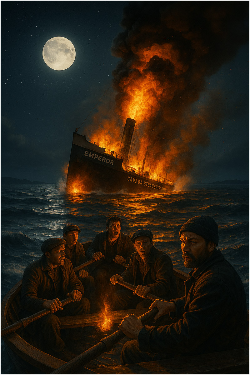 Men were in the water now, some striking out for the lifeboats, others thrashing in shock. Their cries carried across the still night, fainter with each breath.