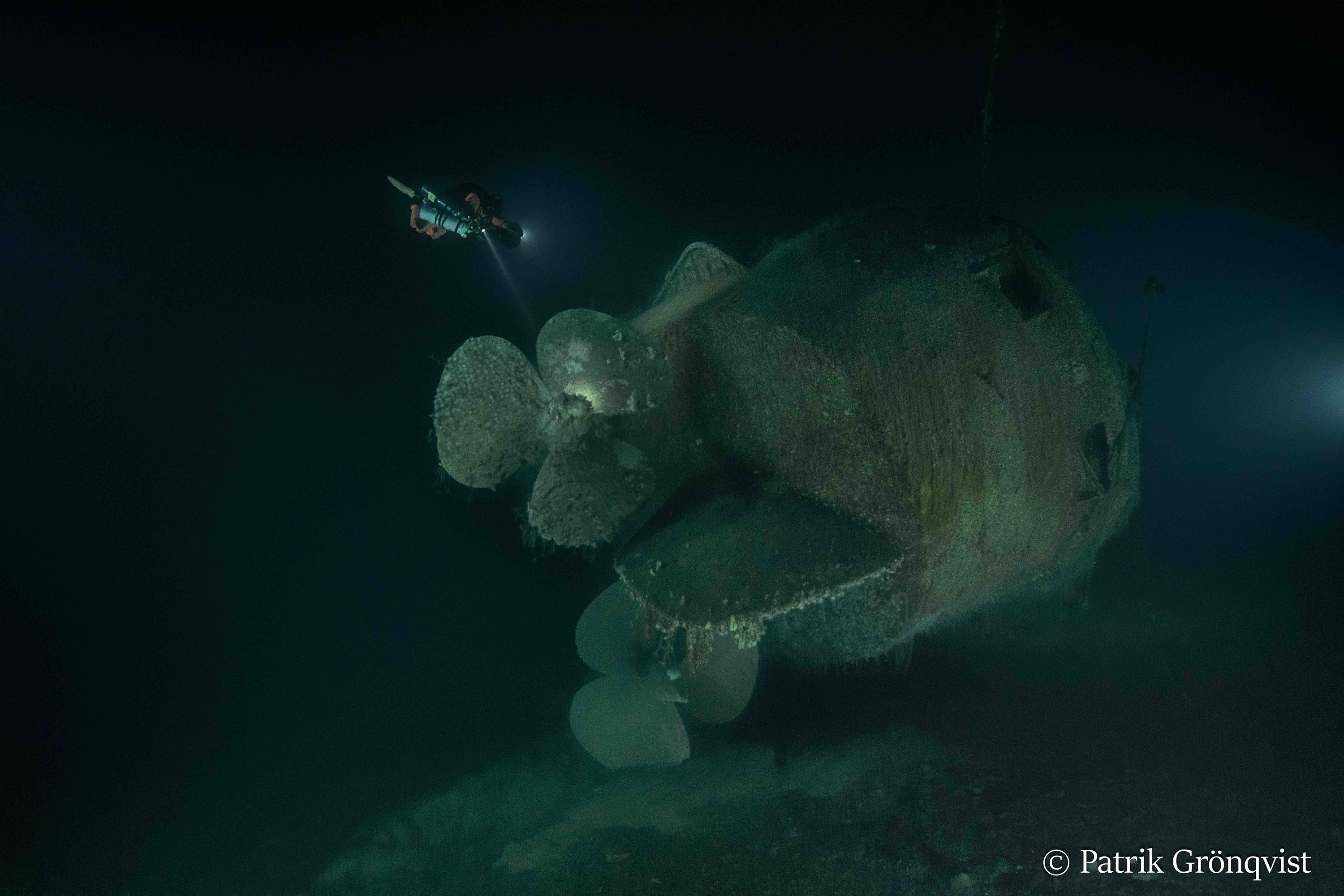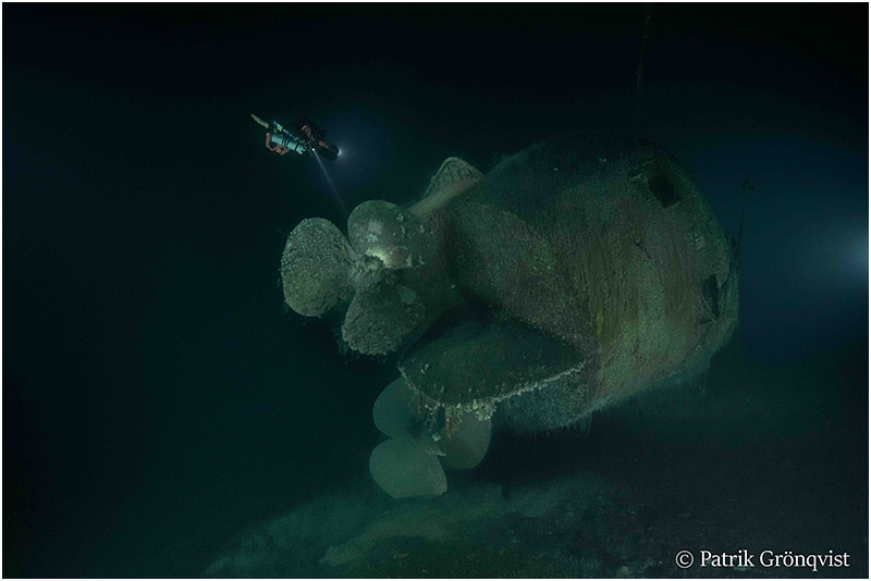 ORP Grom — Polish Navy Destroyer, Narvik, Norway — At a depth between 90 and 110 metres, a technical diver hovers beside the massive twin propellers of the Polish destroyer ORP Grom wreck, frozen in silence since the Battle of Narvik in 1940. Once among the most powerful destroyers afloat, Grom met her end after being struck by German air attack while engaging enemy forces in Ofotfjord. The enormous propellers, now coated in marine growth, speak of speed, power, and wartime urgency—contrasting starkly with the stillness of the cold Arctic water that now preserves the wreck as a war grave.