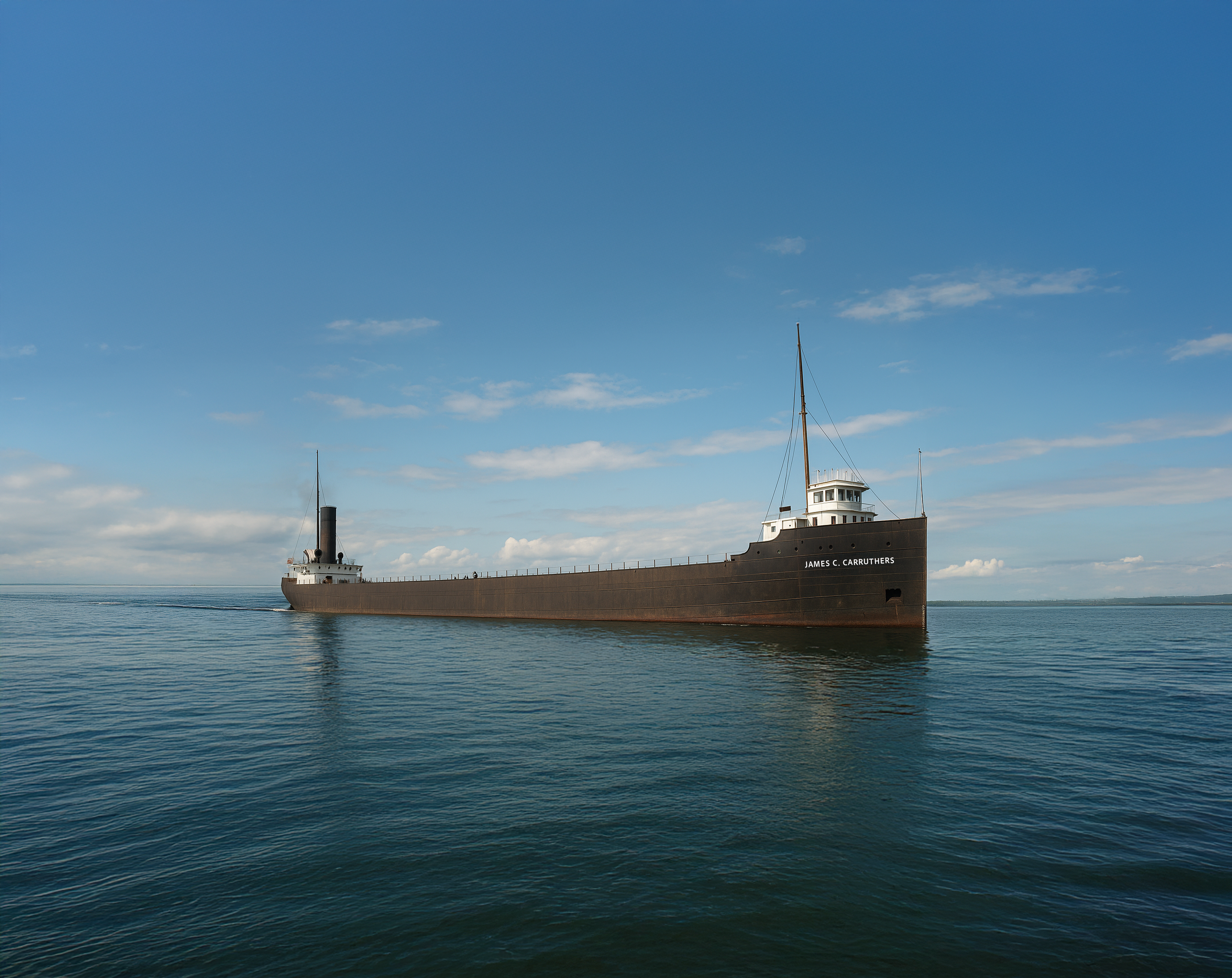 When launched at Collingwood in June 1913, the Carruthers was celebrated as a marvel of modern shipbuilding. Named for James Carruthers, president of the Richelieu & Ontario Navigation Company, she was the largest freighter ever built in Canada. She carried innovations unusual for her time: a wireless transmitter, electric telephones, and hydraulic steering gear. Her builders even sacrificed carrying capacity for extra steel bracing, convinced she was one of the safest ships afloat.