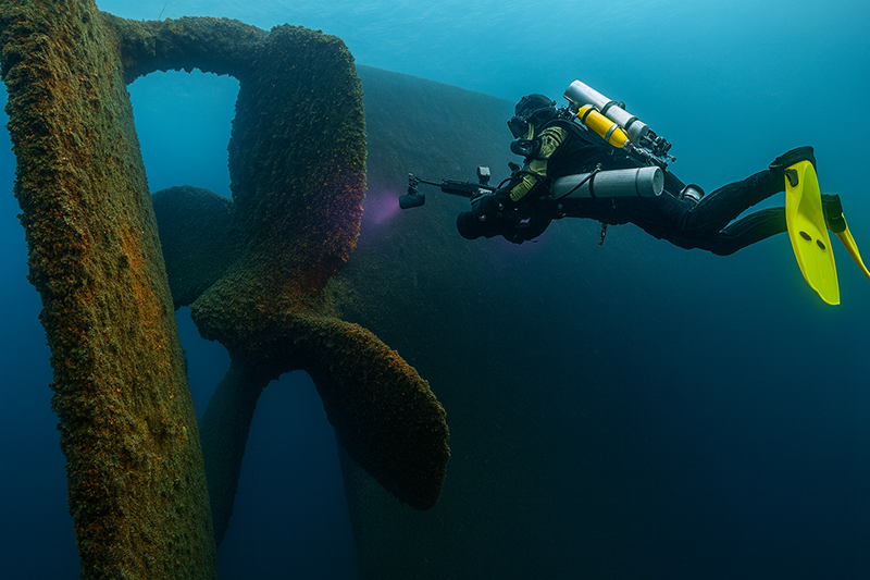 Above: Cindy Lynch, one of eight divers that went 190 feet to the bottom of Lake Huron to explore the James Carruthers as she swims around the propeller of the steel-hulled freighter James Carruthers.