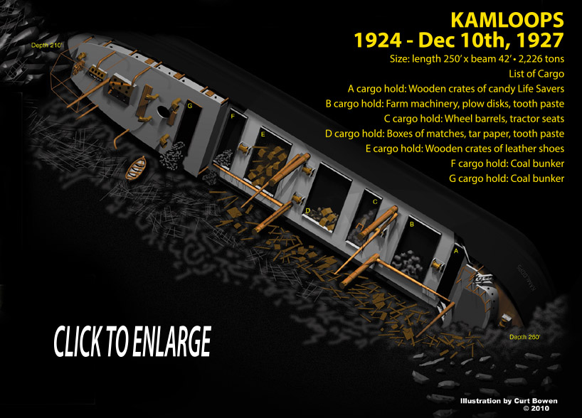 Exiting the protective harbor of the Ranger Station, Ron cruised along the island’s north shore for another four hours until we finally reached our destination, the wreck site of the Kamloops. Two buoys marked the location of the wreck, one on the ship’s stern and the other on the bow. What I found particularly impressive was that the stern buoy was located less than 150 feet from the 30-foot rocky cliffs and jagged rocks of the island. Impressive, because the depth on the stern (closest to shore) of the Kamloops is over 200 feet deep and slopes downward, away from shore, to a depth at the bow of 265 feet.