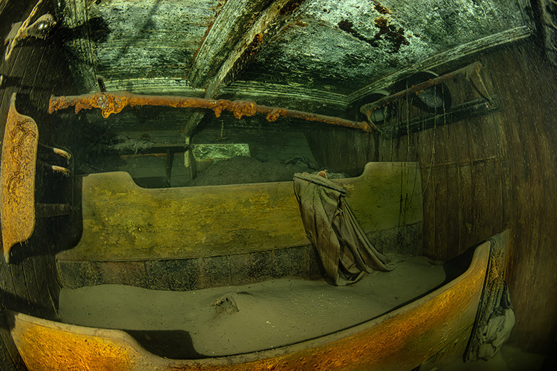 Look closely, and in the upper right you’ll see a haunting detail—two bowler hats, still resting neatly on the rack, as if their owners might return at any moment. There are aspects of this photograph I might change, yet the memory of capturing it remains one of the most demanding—and rewarding—moments of my diving life.