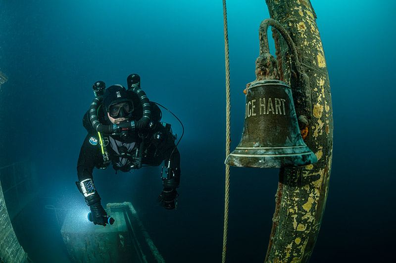 On most wrecks, the ship’s bell is either long gone or hidden away in some inaccessible spot. Not here. The Hart’s bell is proudly displayed, gleaming in the shadows, and it practically begs divers to frame it in their viewfinders.