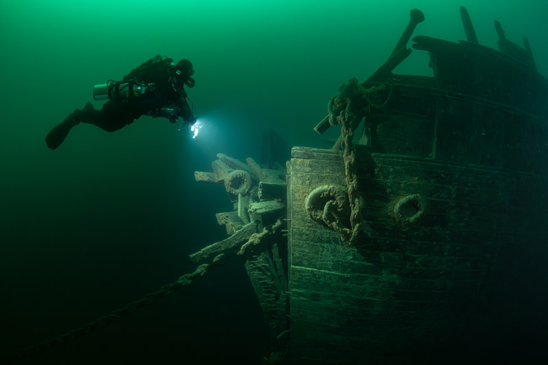 On this dive, I chose to focus on a single area, with Bob Larson lighting up the impact damage to give the scene scale. The beautifully clear waters of Lake Huron made the shot all the more rewarding—a rare treat in itself.