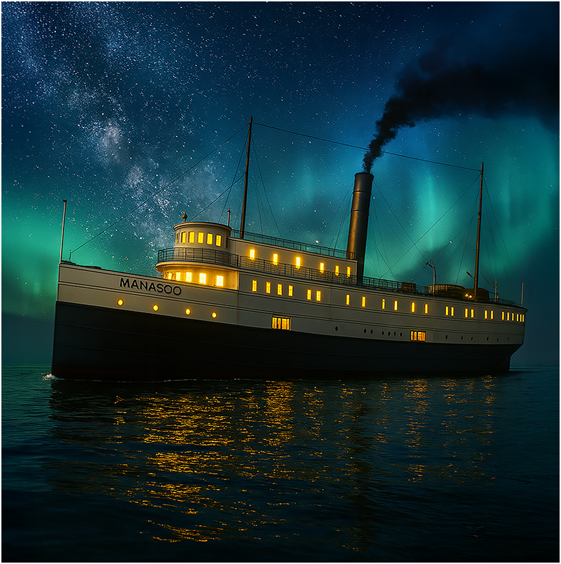 At 11 p.m., the SS Manasoo finally stirred to life. Lines were cast off the dock, coiled and hauled aboard. The steamer’s whistle bellowed across Manitowaning harbor, scattering gulls into the night air. Her propellers churned the black water as the vessel eased into the channel, hull heavy with the weight of cattle, machinery, and one gleaming Chevrolet coupe secured below.