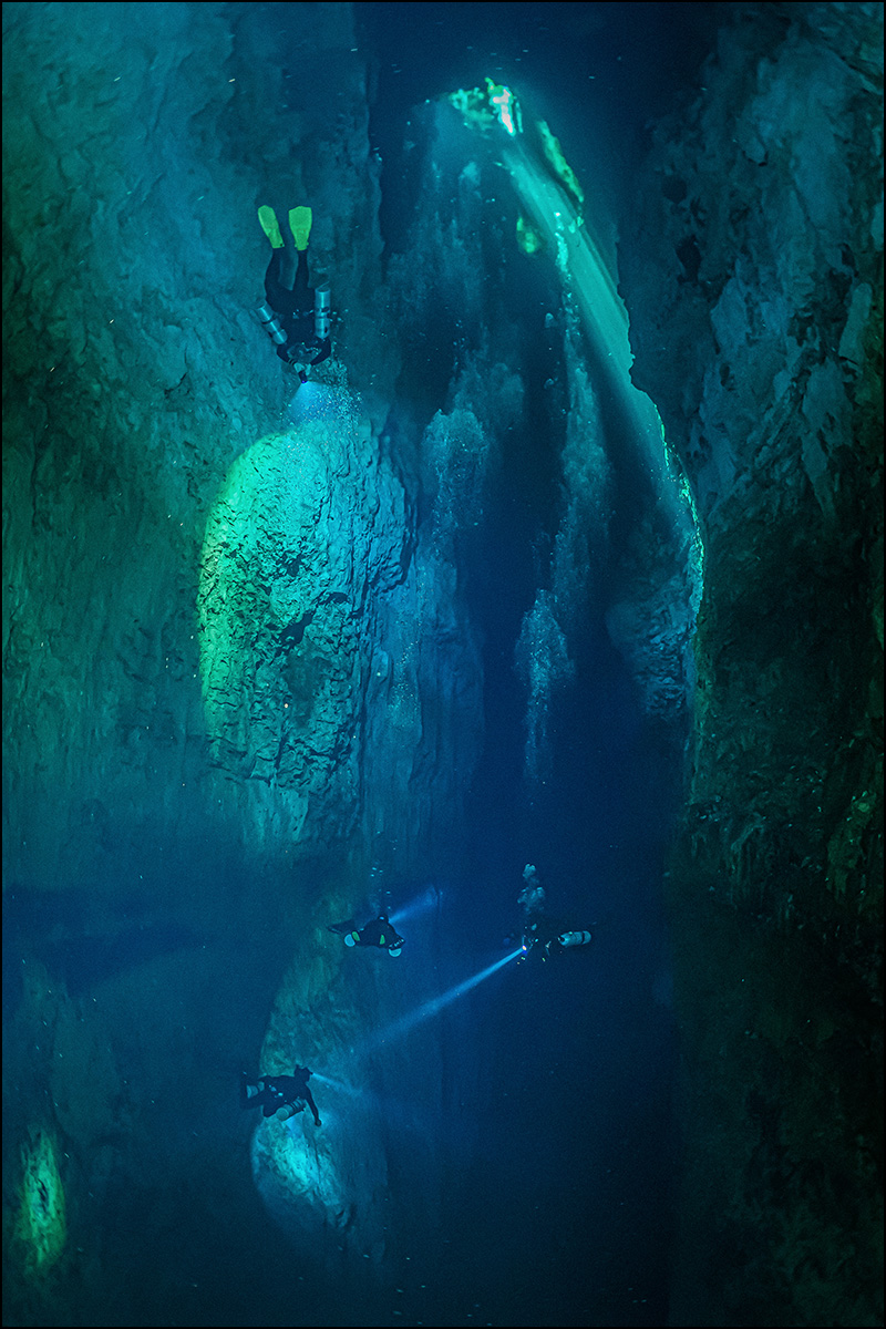 Below: El Brinco cavern, Cuba, with sunburst and bright halocline