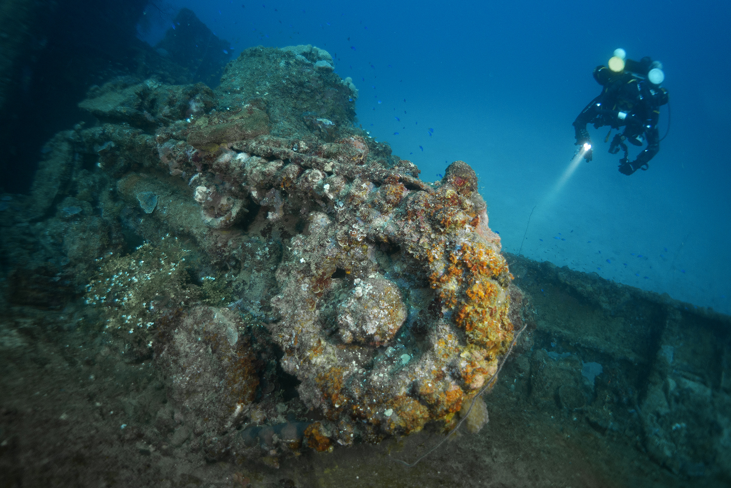 Above: Underwater photographer freediver takes pictures of the ferry Zenobia, Cyprus, depth 30 meters