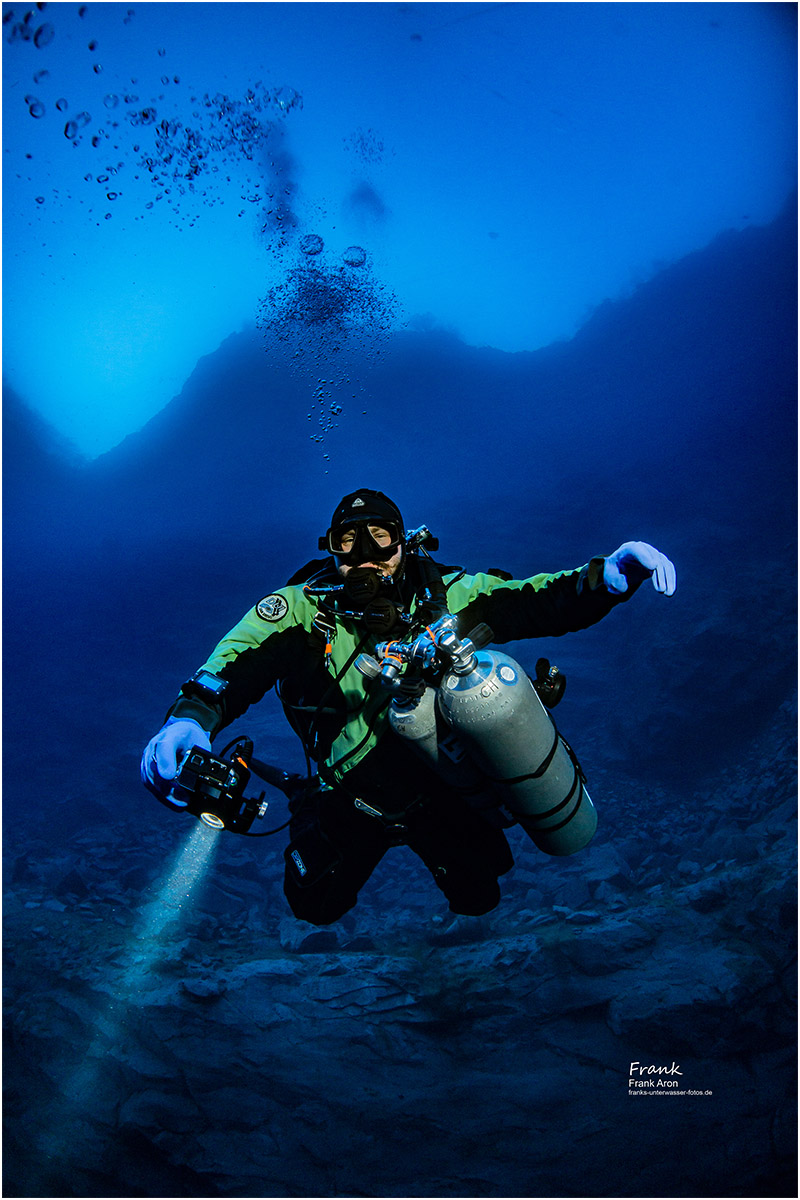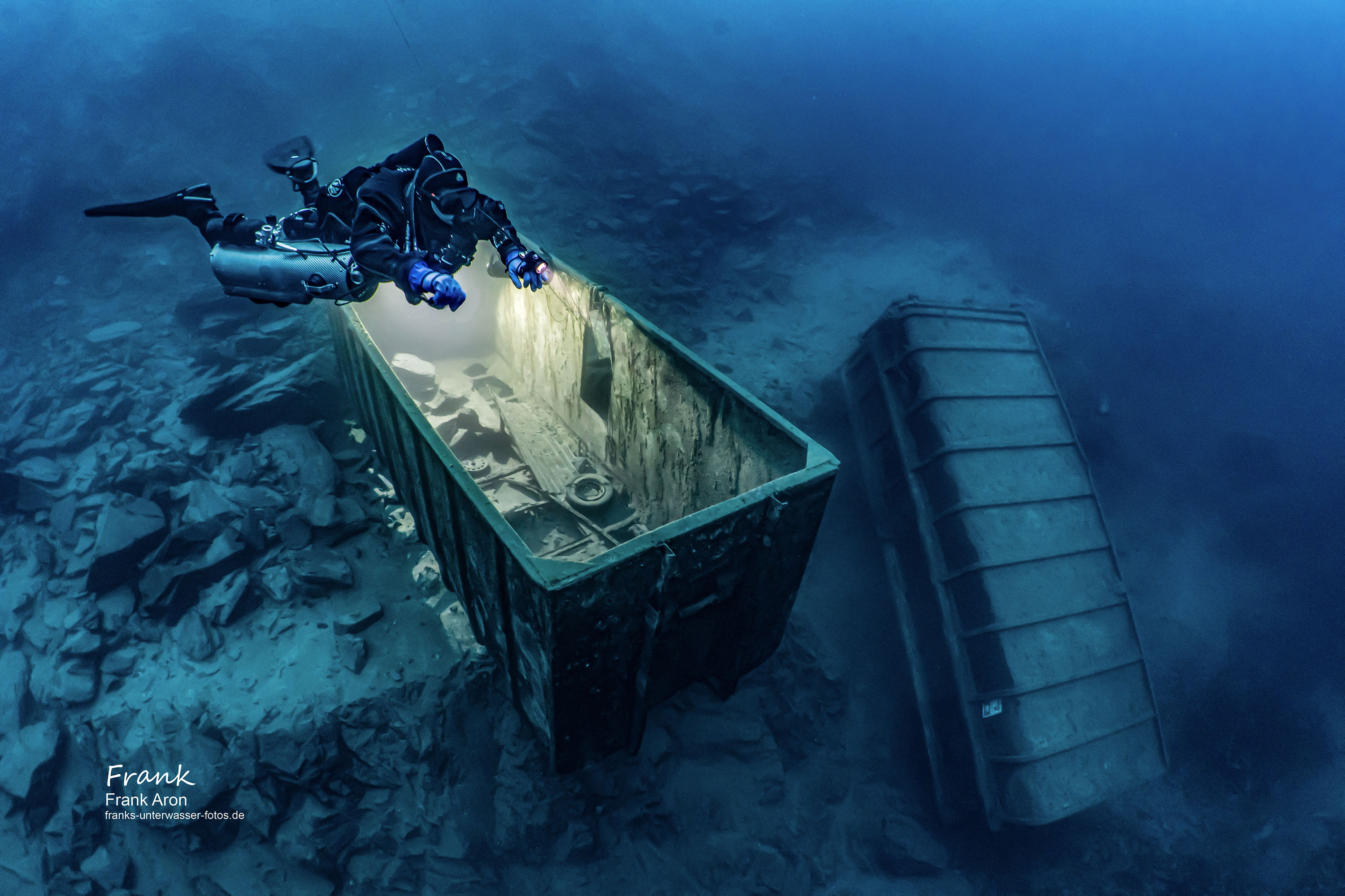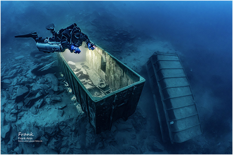 When reaching 130ft / 40m, the visibility is so good you can often see over half of the bottom of the quarry. Divers in the past have sunk multiple items in the quarry, such as large box containers, round concrete tubes and a few small boats. The big prize sunk in the lake is a real German military ship. After departing the deep region, you ascend past some old cars, such as a “Trabant”, the former “Volkswagen” of the German Democratic Republic and a mannequin dressed in a German GDR military outfit.