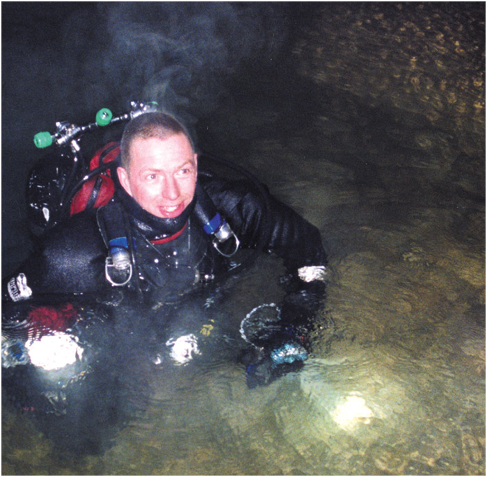Alex had decided that having been to Russia twice now that the next trip the following February would be somewhere cold! So after another four-day drive, I found myself loading dive gear onto a sledge for a 12-hour journey up the frozen and snow covered White River to the base camp for our next dive site. This time we had driven East to the Ural mountain range that separates Europe and Asia. Air temperature varied between –20ºC/4ºF and –40ºC/-40ºF and when we finally arrived, the resurgence sump we were to dive had a water temperature of 2ºC/35ºF.