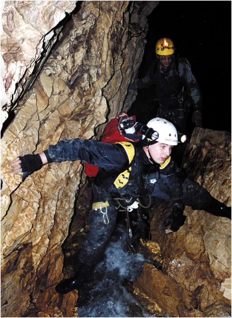 It took four days of rigging, hauling, and carrying to get the gear to sump 1. We then did a recognisance dive. Sump I can be followed in rapidly descending passage to a depth of 30m/100ft where the entire water flow issues from a low, wide slot only 15cm/6 inches high just beyond the elbow of the sump. Looking into this slot, the passage can be seen to ascend and enlarge to the limit of visibility. Further back at 14m/45ft, a sideline leaves the main water flow and passes through boulders to surface in a small muddy pool at the base of an ascending vertical rift. This continuation leads up via 30m/100ft of easy free climbing to a 50m/164ft hands and knees crawl and a large boulder floored chamber. From the chamber, a very unstable 45-degree boulder slope must be descended using a rope and descender to a small and very uninviting pool of brown water, which is sump 2.