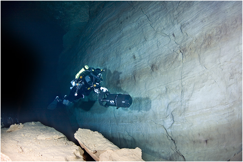 Unfortunately for both Challen and Harris equipment problems meant that they were unable to reach the end of Challen’s line laid in 2008. As disappointed as they were, they would wait for the word of Rick Stanton after he had made his attempt of just how much further a diver can explore. On the surface, the progress of each exploration divers was being monitored using radiolocation pingers, which also helps to map the cave system. Below the surface my plan was to see Rick safely off from the lake and later that night meet him at the ‘Rock Pile’ between sump one and two. From the rock pile, I was able to radio the surface and let the camp above know Rick was back safe, which was, of course, when he arrived. Ric acknowledged Agnes Milowka in passing in sump three just before the waiting room, then eventually reaching the end of Craig Challen’s line, Rick tied his own line off to the end of it before progressing only a few meters. Here the cave takes on the nature of wide bedding plane possibly 20-30m wide, only big enough for a diver to navigate by passing through rock erosion features and channels in the floor. Rick had little if anything to belay his line to and found the going elbow deep in mud with zero visibility. As this is a percolation cave, it appears that the point reached by Challen in 2008 could well be the source of the water intake. Rick reeled in the few metres of line he ran out and retreated, claiming no more passage to be found and that Challen had officially got to the most remote part of the cave the year before. Quite possibly more progress could be made, but at this point in the cave there is little possibility of it opening up again and it will certainly become too small for a human to progress not far beyond. Agnes Milowka and Ken Smith were back at Toad Hall to video Ric's comments on his push dive before exiting themselves and bringing with them a haul of cylinders, which began the big ‘after push’ clean up.