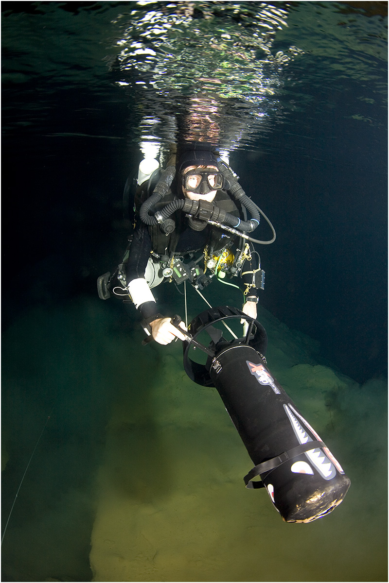 Cocklebiddy is regarded as the Mount Everest of cave dives in the southern hemisphere and only a handful of experienced and trained cave divers venture into the magnificent sump two. The cave is broken down into three dives; sump one which is 1.2km in length and runs from the lake to a rock pile air chamber. The diver than has to take all of their equipment off and carry it over a 100m of collapsed rocks before descending the rocks again to sump two. The spectacular sump two is 2.5km in length before it arrives at ‘Toad Hall’ where the diver once again removes all of their equipment and carries it over to sump three, a distance through varying chambers of 220m. Sump three is approx 1.7km in explored distance of which 1.2km is reasonably large and easy going before it closes down a lot smaller but is still large enough to swim through with back mounted diving equipment. The diver than gets to approx 1.5km into the sump where the passage then becomes too small and tight to swim with a back mounted system. From here the way on becomes a side mount equipment dive then only after approx another 100m or so the passage becomes even smaller, enough for the size of a diver to fit in and hence a ‘No Mount’ dive i.e. the divers has to push whatever it is he or she is breathing from in front of them! Of course, if you are at this point, the likelihood is that after a distance of 5.7km into the cave, you’re not using conventional scuba. The push divers on this expedition were using a variation of their own homemade rebreather configurations, which run in considerably smaller than a standard manufactured unit. These were transported to the far end of the cave before being used for the final pushes.