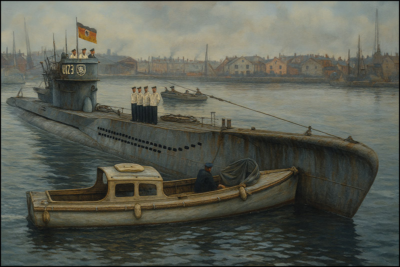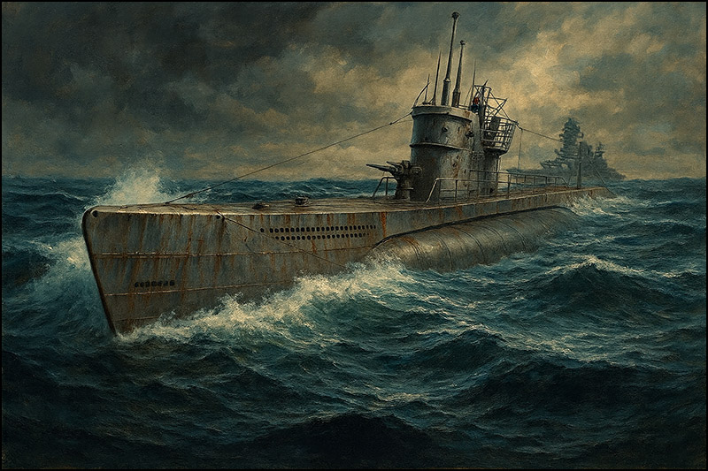 The diesel engines cut out. Battery power engaged. The boat shifted to silent mode, her Brown, Boveri & Cie electric motors humming faintly, inaudible outside her hull. In moments, the Atlantic swallowed them whole.