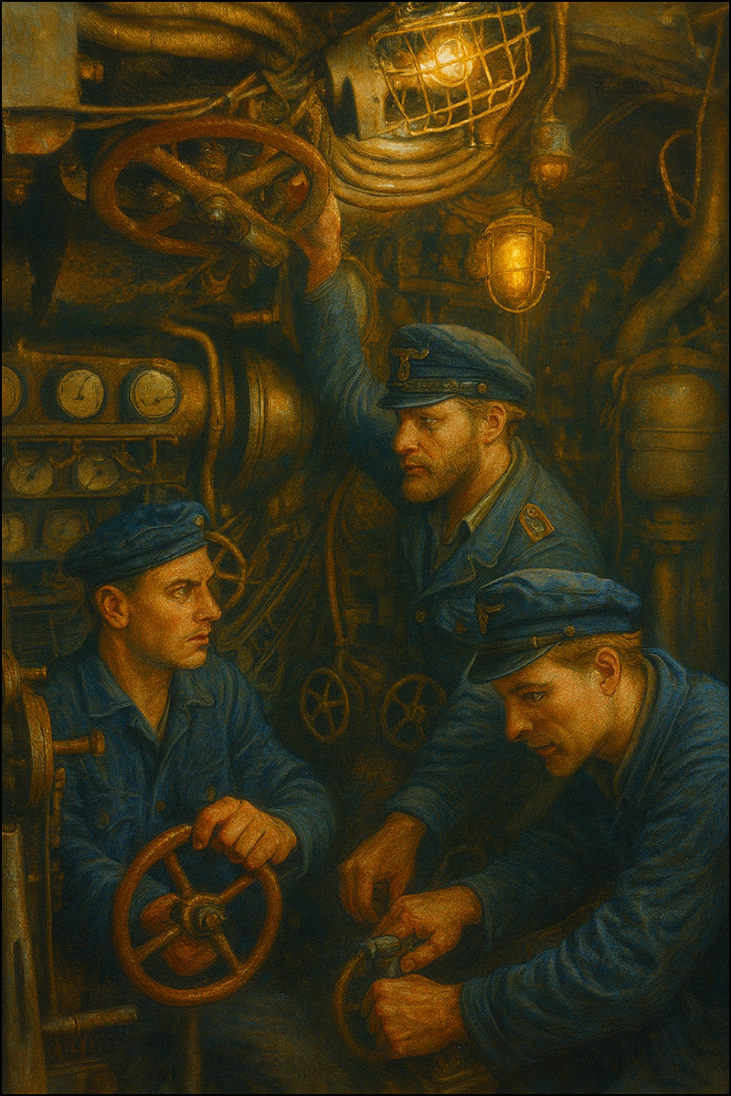 Bootsmann Otto Baker was hunched over the control station midship, eyes flicking across the ballast indicators and pressure gauges. His hands were cracked from cold and engine grease. Despite the noise, he felt it before he heard it — a shift in rhythm. The hull had developed a low-frequency resonance. Subtle, but wrong.