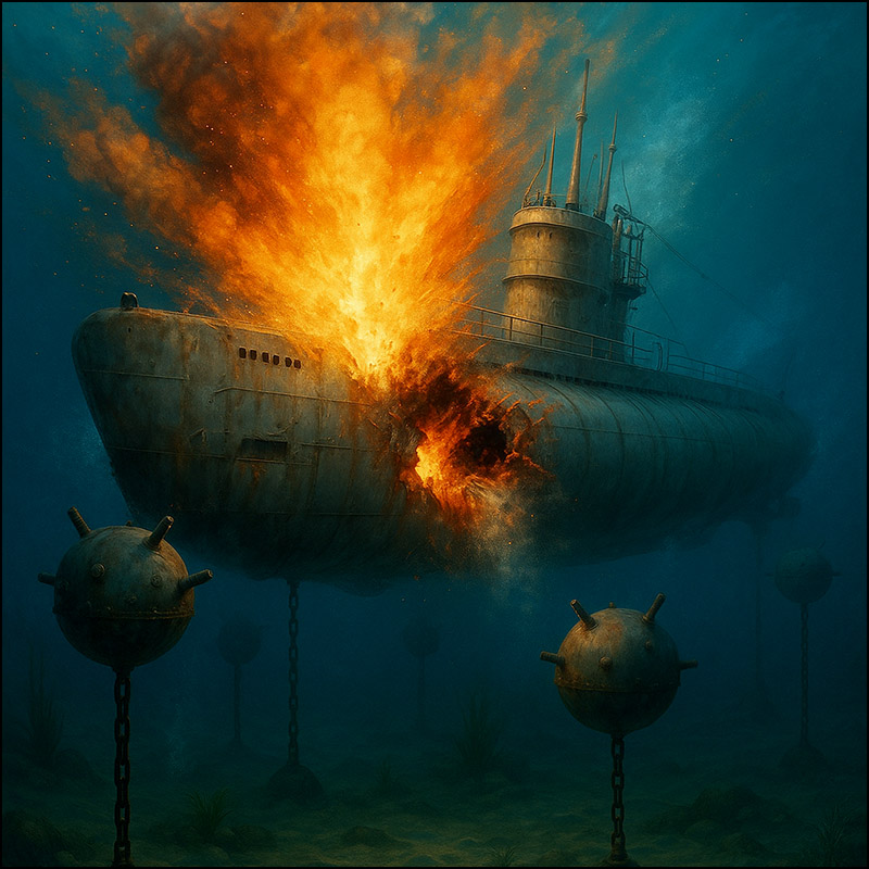 A high-order detonation slammed into the front quarter. No delay. No mercy. The pressure hull failed in a second — bulkheads rupturing, compartments flooding. The explosion overpressurized the stern, vaporizing the forward rooms. The power grid collapsed. Lights out.